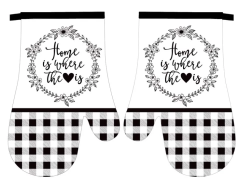 Kuchyňské rukavice (chňapky) v bíločerné barvě s motivem Home is where heart is. Rukavice jsou opatřeny praktickým poutkem. Jejich velikost je 16x27 cm a jsou vyrobeny z 90% polyesteru a z 10 % bavlny.