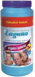 Bazénová chemie na chlorové ošetření bazénové vody. Trojkombinace dezinfikuje, vločkuje nečistoty a má preventivní účinek proti řasám.Laguna Triplex tablety slouží jako dezinfekční přípravek pro.celosezóní průběžnou údržbu vody ve všech typech bazénů. Současně.umožňuje vyvločkování nečistot, likviduje řasy a zabraňuje.jejich růstu.Dávkování: Po napuštění.vody nejprve upravte hodnotu pH vody na 6,8 – 7,6 a proveďte počáteční.šokovou dezinfekci vody. Tablety se přidávají skimmerem, poloautomatickým.dávkovačem vestavěným do cirkulačního potrubí nebo plovákem při.zapnutém filtračním zařízení. POZOR – nikdy neházejte tablety přímo.do bazénu!!! Je nutné udržovat obsah aktivního chloru v rozmezí 0,3 –.0,8mg/l. Dle teploty vody přidávejte každých 6 – 8 dnů 1 –.2 tablety (200 – 400g) na 30m3 (30000l) vody, 1 tabletu při teplotě do.25°C, 2 tablety nad 25°C. Hodnotu pH a obsah chloru kontrolujte cca 1 –.2 x týdně a zjištěné odchylky od ideální hodnoty regulujte přidáním.odpovídajícího přípravku.Používejte biocidní přípravky bezpečně. Před použitím vždy.přečtěte údaje na obalu a připojené informace o přípravku!