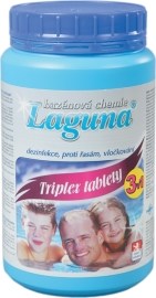 Bazénová chemie na chlorové ošetření bazénové vody. Trojkombinace dezinfikuje, vločkuje nečistoty a má preventivní účinek proti řasám.Laguna Triplex tablety slouží jako dezinfekční přípravek pro.celosezóní průběžnou údržbu vody ve všech typech bazénů. Současně.umožňuje vyvločkování nečistot, likviduje řasy a zabraňuje.jejich růstu.Dávkování: Po napuštění.vody nejprve upravte hodnotu pH vody na 6,8 – 7,6 a proveďte počáteční.šokovou dezinfekci vody. Tablety se přidávají skimmerem, poloautomatickým.dávkovačem vestavěným do cirkulačního potrubí nebo plovákem při.zapnutém filtračním zařízení. POZOR – nikdy neházejte tablety přímo.do bazénu!!! Je nutné udržovat obsah aktivního chloru v rozmezí 0,3 –.0,8mg/l. Dle teploty vody přidávejte každých 6 – 8 dnů 1 –.2 tablety (200 – 400g) na 30m3 (30000l) vody, 1 tabletu při teplotě do.25°C, 2 tablety nad 25°C. Hodnotu pH a obsah chloru kontrolujte cca 1 –.2 x týdně a zjištěné odchylky od ideální hodnoty regulujte přidáním.odpovídajícího přípravku.Používejte biocidní přípravky bezpečně. Před použitím vždy.přečtěte údaje na obalu a připojené informace o přípravku!