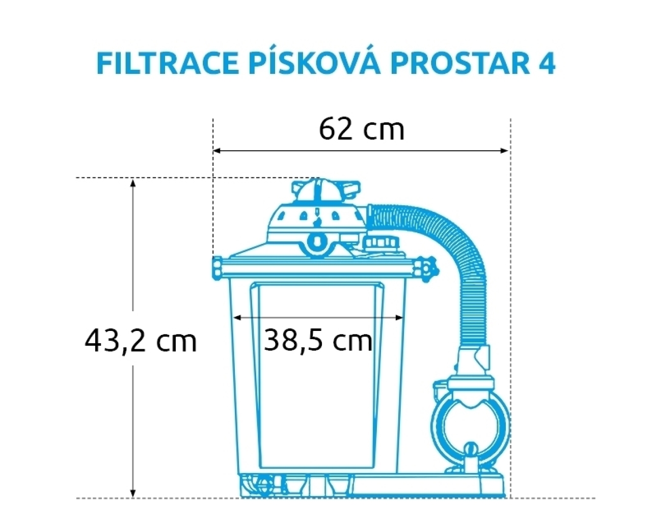 Piesková filtrácia ProStar 4 sa vo svojom princípe inšpirovala prírodou - tu sa tiež dažďová voda mení v krištáľovo čistú pramenitú vodu vďaka filtrácii v priepustných vrstvách horniny. V pieskovej filtrácii voda prechádza cez kremičitý piesok, kde sa zachytávajú aj jemné nečistoty a do bazéna sa vracia len čistá, filtrovaná voda. Dôležité je preto často filtračný piesok preplachovať, aby sa nečistoty v piesku neosazovaly.Odporúčame preplach filtrácie minimálne raz týždenne.Parametre filtrácie:.Prietok vody: 4 m3 / hod.Hmotnosť pieskovej náplne: 17 kg.Príkon filtrácia: 200 W.Pre bazény do: 20 m3.Vhodné pre: Nadzemné bazény.Pre hadice s priemerom: 32 a 38 mm.Farba filtrácie: Modrá.Zloženie a popis pieskovej filtrácie.Filtračný systém pieskovej filtrácie ProStar 4 sa skladá z filtračnej nádoby, do ktorej sa zmestí 17 kg filtračného piesku.Nádoba je vyrobená z vysoko kvalitného polypropylénu (PP). Je bez švov, odoláva korózii a bežne dostupným chemikáliám používaných v bazénoch.Filtrácia je vybavená odvodňovacím ventilom, tlakomerom, vstavanými komponenty filtračnej nádoby vrátane ľahko ovládateľného 6-ti cestného ventilu (ktorý je zabudovaný do veka filtračnej nádoby), motorom čerpadlá s príkonom 200W, plastovou základňou pre montáž v mieste inštalácie. Systém je vyrobený z vysoko kvalitných materiálov pri prísnom dodržiavaní technických noriem a prechádza výstupnou kontrolou.Obsah balenia:.Piesková filtrácia.Návod.Upozornenie:.Štandardne je piesková filtrácia dodávaná bez filtračného piesku a hadíc. Ak tieto produkty nemáte, odporúčame ich kúpiť súčasne s pieskovou filtráciou.Odporúčania k zníženiu nákladov na prevádzku:.Pokiaľ využívate zníženú sadzbu elektriny (tzn. Nočný prúd), môžete filtráciu zapnúť v čase, keď je táto tarifa aktívny. K filtráciu si môžete v hobbymarketoch či na internete dokúpiť spínacie hodinovú zásuvku, ktorá filtráciu v nastavenom čase vypne aj zapne. Môžete tým podstatne znížiť náklady na prevádzku.ILUSTRAČNÉ FOTO.