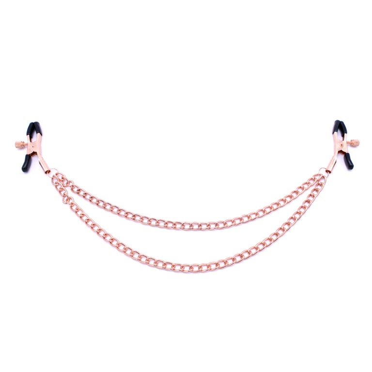 Hledáte nádherný a zároveň nebezpečný doplněk pro smyslné potrápení vašich bradavek? Není řetízek jako řetízek! Tentodvojitý růžově-zlatý propojí vaše bradavky a vy si sami zvolíte, jak velký tlak na ně vytvoříte. A co se pak asi stane, když za řetízek zatáhnete?