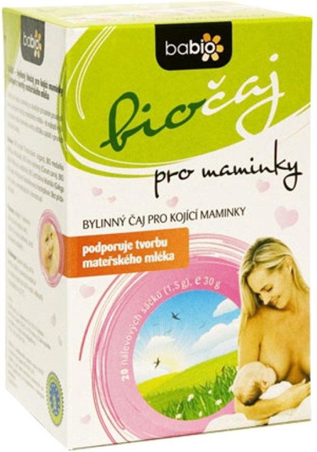 BABIO Biočaj pro maminky 20×1.5gPopis:U Babio čaje pro maminky v BIO kvalitě oceníte především jeho snadnoupřípravu a přirozenou bylinnou chuť. Účinky bylin jsou popsányv Detailních informacích.Návod k přípravě:Jeden nálevový sáček přelijte 200 ml vroucí kojenecké vody, nechte10 minut louhovat. Před podáváním ochlaďte na vhodnou teplotu.Uchování:Po každém použití obal řádně uzavřete.Detailní informace:Tento produkt je vhodný pro děti od ukončeného osmého měsíce. Čajobsahuje plody fenyklu, které uvolňují křeče hladkého svalstva. Užívajíse jako prostředek proti nadýmání a ke zvýšení činnosti střev.Zvyšují vylučování mléka.[1] Meduňka patří mezi rostliny,jejichž účinné látky ovlivňují žaludeční funkci a působí protinadýmání. Používá se při nespavosti.[1] Kmín kořennýpatří mezi rostlinné prostředky účinné proti nadýmání, které jednakuvolňují stahy hladkého svalstva, a tím usnadňují odchod střevníchplynů, jednak potlačují vývoj kvasných bakterií. Zvyšuje téžvylučování mléka a podporuje vykašlávání při onemocnění dýchacíchcest.[1] Jestřabina lékařská podporuje a zvyšuje činnostmléčných žláz. Užívá se při nedostatečném vylučování mlékau kojících matek.[1] Čaj neobsahuje kofein ani lepek. Neobsahuje GMO, sacharózu, konzervačnílátky, aromata a barviva. Nálevové sáčky jsou baleny bez kovových sponek.Obsah balení je 30 g (20 nálevových sáčků). Tento BIO čaj byl kladněposouzen Českou pediatrickou společností.[1] KORBELÁŘ, J., ENDRIS,Z. Naše rostliny v lékařství. 6. vydání. Praha: Avicenum n.p.Zdravotnické nakladatelství, 1985. 504 s. ISBN 735 21–08/31.{tip: Čaj doporučujeme osladit BABIO mléčným cukrem, který je pro dětizcela přirozený a nevede ke zvýšení kazivosti zubů!}Složení potraviny:fenykl* – plod (Foeniculum vulgare), meduňka* – list (Melissaofficinalis), kmín kořenný* plod (Carum carvi), ibišek* – květ(Hibiscus sabdariffa), jestřabina lékařská* – nať (Galegaofficinalis).* z ekologického zemědělství.