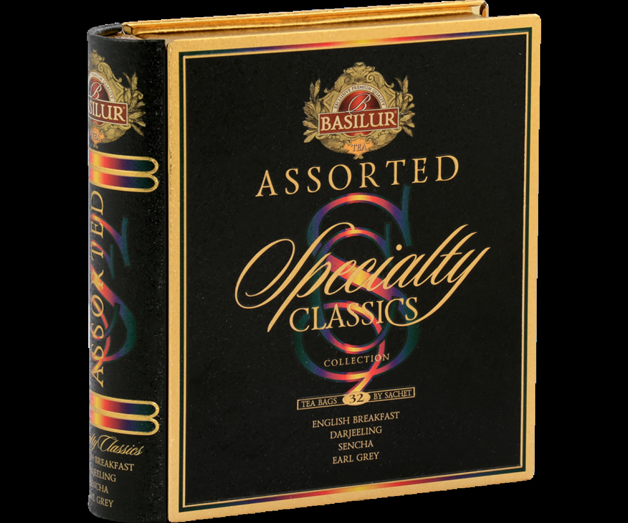 Směs černých a zeleného čaje, porcovaná, Složení: Breakfast, složení: černý čaj. Darjeeling, složení: černý čaj. Sencha, složení: zelený čaj. Earl Grey, složení: černý čaj, bergamotové aroma.