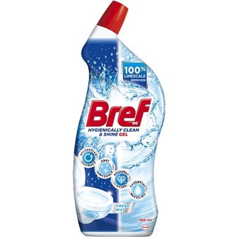 WC čistič pro dokonale čistou a svěží toaletu Není vyplněn Alternativní text k fotografii!WC čistič BREF Hygiene gel Fresh MistBref WC gel zbaví vaši toaletu všech nečistot a bakterií díky účinnému složení v podobě kyseliny mravenčíPůsobí proti vodnímu kameni a dodá vaší toaletě leskBref WC chrání vaši toaletu před dalším usazováním nečistotTento Bref WC gel má hustší konzistenci oproti jiným přípravkům, a díky tomu lépe a efektivněji toaletu vyčistíSložení obohaceno o esenciální oleje se svěží vůníNení vyplněn Alternativní text k fotografii!Účinné složeníNení vyplněn Alternativní text k fotografii!Působí prosti vodnímu kameniNení vyplněn Alternativní text k fotografii!Dodává toaletě leskNení vyplněn Alternativní text k fotografii!Obsahuje esenciální olejePoužitíNení vyplněn Alternativní text k fotografii!Naneste Bref WC Hygiene& Shine gel podél toalety.Není vyplněn Alternativní text k fotografii!Díky speciálnímu uzávěru je možné Bref WC gel snadno.