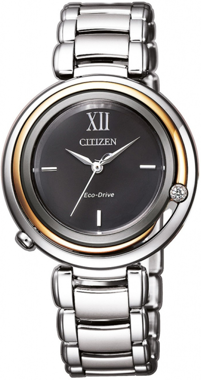 Charakteristika:.Púzdro - oceľ s PVD povrchovou úpravou.Vodotesnosť - 5 ATM.Remienok - oceľ.Sklo - zafírové.Rozmery - 31 x 8 mm.Tvar púzdra - okrúhly.Farba púzdra - zlatá / strieborná.Farba ciferníku - čierna.Napájanie - solárny pohon (ECO DRIVE), 180 dní rezerva chodu.Štýl - módne.Stav - nový.