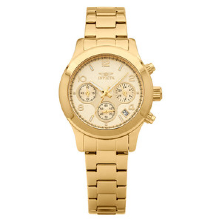 Športové hodinky Invicta z kolekcie Angel. Ideálny doplnok pre ženy uprednostňujúci analógové a guľaté hodinky. K ich skrášleniu naviac výrobca zvolil. Vo vnútri odolného, 13 mm vysokého púzdra, ktoré tvorí kvalitný oceľ nájdete spoľahlivý batériový (quartz) strojček poháňajúci v priemere 38 mm široký ciferník. Ten spoľahlivo chráni odolné flame fusion sklíčko. Ako sami vidíte, púzdro zahalila zlatá, ciferník zlatá a remienok zlatá farba. Z hľadiska materiálu vedie oceľ a jeho dĺžku, v tomto prípade 210 mm si môžete ľahko upraviť na obvod svojho zápästia. Tieto hodinky disponujú stupňom vodotesnosti 10 ATM.
