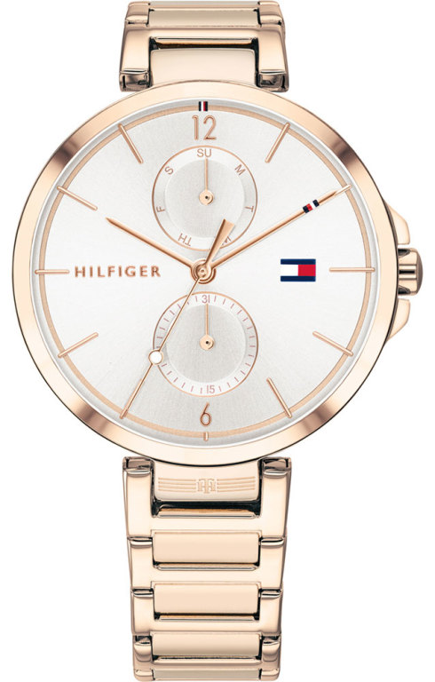 Módní hodinky Tommy Hilfiger z kolekce Angela. Ideální doplněk pro ženy upřednostňující analogové a kulaté hodinky. Uvnitř odolného, 8 mm vysokého pouzdra, které tvoří kvalitní ocel, najdete spolehlivý bateriový (quartz) strojek pohánějící v průměru 36 mm široký ciferník. Ten spolehlivě chrání odolné minerální sklíčko. Jak sami vidíte, pouzdro zahalila růžové zlato, ciferník růžové zlato a řemínek růžové zlato barva. Z hlediska materiálu mu vévodí ocel. Tyto hodinky disponují stupněm vodotěsnosti 3 ATM.