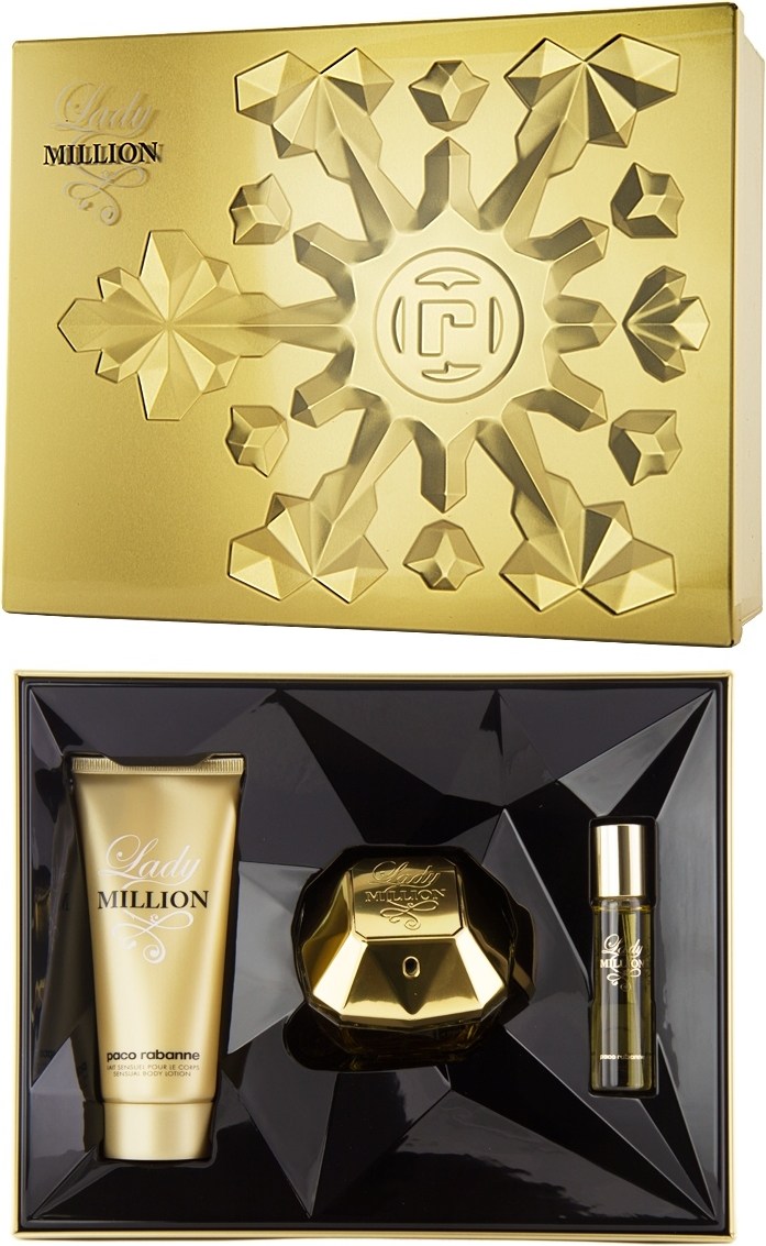 .Dva roky po vydání velmi úspěšné vůně pro muže 1 milión značky Paco Rabanne se objevila na scéně také ženská verze s názvem Lady Million. Vůně parfémované vody je inspirovaná zlatem a bohatstvím. Bylo více než jasné, že nová vůně pro ženy by měla být stejně charismatická jako vůně pro muže, se silným podpisem, ale bez přímého spojení vonných složek. Žena, která nosí vůni Lady Million je oslňující a vždy svůdná. Vyjadřuje svůj ohnivý charakter a nebezpečnou smyslnost.Vůně parfémované vody Paco Rabanne Lady Million je svěží, květinová s dřevitými tóny. Je jako nektar smyslných květin, jemná, ale zároveň silně útočící na vaše smysly. Svůdný nádech hořkého květu afrického pomerančovníku s nádechem sladké maliny odhaluje první tóny. Poté na řadu plynule přichází neroli, který se prolíná s arabským jasmínem, jehož vůně je zvýrazněna gardénií. Nyní se hlásí o slovo pulzující pačuli, které vytváří jedinečné spojení s lákavou sladkou vůní bílého medu. Flakon vůně je v souladu s kompozicí a názvem vůně. Svým tvarem znázorňuje dokonalý zlatý diamat, protože pouze diamant může konkurovat zlatu. Nechte se strhnout bohatou vonnou kompozicí vůně parfémované vody Paco Rabanne Lady Million i vy.Dotkněte se i vy tohoto drahokamu a nechte se unášet vůní plnou luxusu.Na trh byla uvedena v roce 2010.