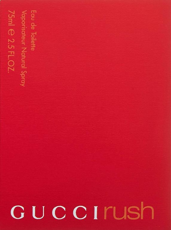 Orientálne kvetinová vôňa, určená pre náročné ženy bez rozdielu veku, ktoré ocenia originalitu a kvalitu. Gucci Rush predstavuje silu a rýchlosť vody, emócií, myšlienky, patrí k ženám, ktoré vedia čo chcú a idú priamo za svojím cieľom. Vrchné tóny parfému sú pod nadvládou frézie a ruží, evokujú jedinečnosť a originalitu ženy. Srdce parfému Gucci Rush je zmesou vanilky a jazmínu a vytvára sladkú a iskrivú vôňu, ktorá opantá všetky zmysly ako droga.Základ vône je korenistý, vertiver a koriander dávajú do popredia pikantnosť a vzrušenie. Flakón je originálny červený štvorec s bielym nápisom Gucci. Dámsky parfém Gucci Rush bol v roku 2000 vyhlásený za najlepší dámsky parfém roka. Tak ako útek v preklade, znamená Rush určitý únik, vôňa vás zavedie do tajomného, vzrušujúceho neznáma. Vôňa uvedená na trh v roku 2000.Zloženie:.Hlava: gardénia,frézia,ružaSrdce: vanilka ,jazmínZáklad: pačuli, koriander.Gucci je Talianska odevná značka. Venuje sa prevažne módnemu, najčastejšie koženému tovaru. Vlastníkom značky je francúzska spoločnosť Kering, ktorú zakladal v roku 1921 Guccio Gucci. Prvé zameranie bolo na produkty okolo vybavenia pre koniarov, neskôr prichádza na radu móda, parfémy, kabelky, topánky. Prvé úspechy zožala v Taliansku, odkiaľ sa sláva rozšírila do celého sveta. V roku 1971 sa začala spolupráca s americkou automobilkou American Motors Corporation, pre ktorú vyrábala poťahy na sedadlá a iné časti do interiéru vozidla. Po smrti Guciho je rodinný podnik rozdelený medzi 4 synov. Aldo Gucci vedie podnik 30 rokov. Po najväčších úspechoch v 70 rokoch sa firma presadzuje aj v Ázii. V roku 1982 sa firma mení na akciovú spoločnosť a z dôvodov pri dedičskom konaní sa polovica firmy ocitá v rukách korporácie z Bahrajnu. V roku 1955 vrcholí spor v rodine vraždou Mauricia Gucciho, vnuka zakladateľa firmy.