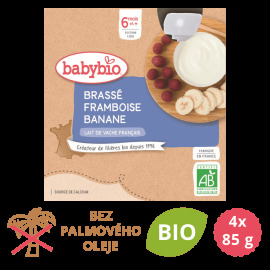 Od ukončeného 6.měsíce. Krémový dezert s krupicí, malinou a banánem s velmi jemnou texturou je vyráběn z pečlivě vybraných bio složek.