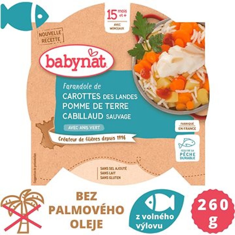 Příkrm masozeleninový, pro děti od 15 měsíců, bez konzervantů a umělých barviv, bez přidaného cukru, bez přídavku soli a bez palmového oleje Pokud hledáte vhodnou variantu příkrmu pro vašeho drobečka, zajisté vás zaujme jídlo od BABYNAT z ekologického zemědělství. Jedná se o obědové MENU v BIO kvalitě pro kojence od ukončeného 15. měsíce věku. Vytvořeno přesně dle nutričních potřeb dítěte v daném věku. Masozeleninový příkrm BABYNAT obsahuje malé kousky, aby dítě trénovalo žvýkání. Mrkev a brambory s treskou je na talířku, na kterém se děti učí samostatnému krmení. Talířek BABYNAT se ohřívá buď v horké vodě a nebo v mikrovlnné troubě. Neobsahuje přidaný cukr, palmový olej, sůl, chemické konzervanty či dochucovadla nebo zahušťovadla. Klíčové vlastnosti mrkve a brambor s treskou BABYNAT 260 gObědové MENU v BIO kvalitě pro kojence od ukončeného 15. měsíce věkuMrkev a brambory s treskouVytvořeno přesně.