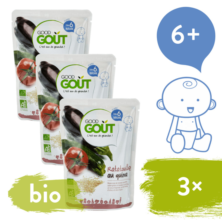 Příkrm zeleninový, pro děti od ukončených 6 měsíců, bez konzervantů a umělých barviv, bez lepku, bez přidaného cukru, bez přídavku soli a bio kvalita.Od michelinských šéfkuchařů a odborníků na výživuNa kombinaci potěšení a správné výživy není nic nadpřirozeného. Je ovšem zapotřebí mít kolem sebe ty správné lidi. Naši rodiče proto odešli hledat talentované kuchaře. Jednomu z nich, majiteli francouzské michelinské restaurace Carré des Sens, pak předali své kuchařské žezlo. Ten se tak o produkty Good Gout už pět let stará spolu s týmem z oddělení výživy Pasteurova institutu ve francouzském Lille, který naše kuchaře zásobuje cennými radami a předává jim nejnovější odborné vědecké poznatky.Od rodičů,pro rodiče100% bioprodukty100% vynikajícíchuť3×Good Gout BIO Ratatouille s quinoou 190 gCuketa, rajčata, lilek a cibule – to je uskupení, které je možné bez nadsázky označit jako spojení superzeleniny. Když k tomu.