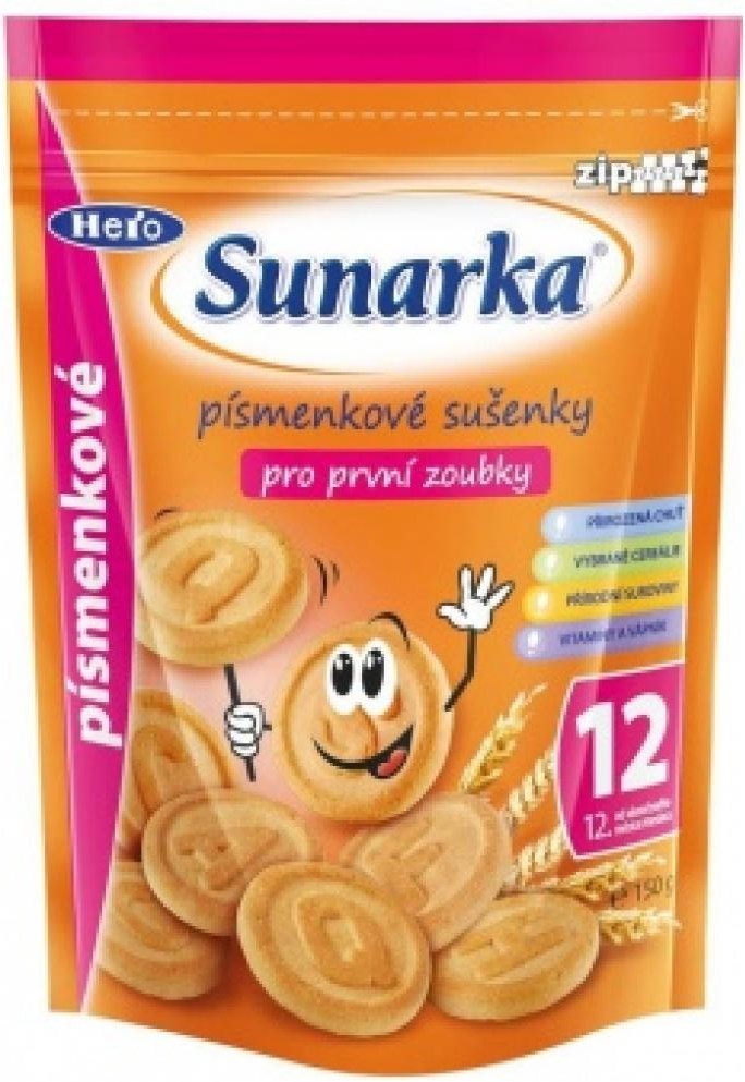 Sunárek Písmenkové sušenky pro první zoubky 150g Písmenkové sušenky obohacené o vitamín B1 a vápník. Obsahují cukr, proto by měly být pro dítě jen zpestřením. Podávejte pod dozorem maminky, aby nezaskočilo. Vhodné pro děti od ukončeného 12. měsíce.