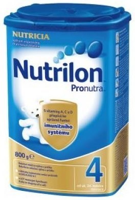 NUTRILON 4 ProNutra vanilka (800 g) –dojčenské mliekoPopis:Batoľacie mlieko Nutrilon ProNutra pre deti od ukončeného24. mesiaca.Dávkovanie a odporúčania:Riaďte sa individuálnou potrebou dieťaťa a odporúčaním vášhopediatra. Pri zavádzaní prvých nemliečnych príkrmov sa riaďteodporúčaniami lekára.Spôsob použitia a ďalšie informácie nájdete na obaloch.Zloženie:Sušené odtučnené mlieko, laktóza (z mlieka), demineralizovaná srvátka(z mlieka), koncentrát srvátkovej bielkoviny (z mlieka), maltodextrín,galaktooligosacharidy (z mlieka) 12%, rastlinné oleje (palmový,slnečnicový, repkový), hydrogénfosforečnan draselný, fosforečnanvápenatý, fruktooligosacharidy 0,844%, rybí olej, uhličitan vápenatý,citrát trihořečnatý, citrát tridraselný, kyselina L-askorbová, chloridsodný, mliečne aróma, emulgátor (sójový lecitín), chlorid draselný,L-askorbát sodný, síran železnatý, síran zinočnatý, cholekalciferol,DL-α- tokoferyl acetát, D-pantothenát vápenatý, kyanokobalamín, kyselinapteroylmonoglutamová (kyselina listová), nikotínamid, DL-α-tokoferol,retinylpalmitát, riboflavín, D-biotín, pyridoxín hydrochlorid, tiamínhydrochlorid, jodid draselný, fytomenadión. Zloženie sa vzťahujek sušenému stavu potraviny.Návod na prípravu mlieka:Umyte si dôkladne ruky a vysterilizujte používaný riad.Prevarte čerstvú pitnú vodu určenú pre dojčatá a nechajte juv kanvici vychladnúť asi 30 minút na približne 40° C.Zodpovedajúce množstvo vody vlejte do vysterilizovanej fľaše.Nepoužívajte opakovane prevarenú vodu.Na dávkovanie vždy používajte priloženú odmerku a prášok zarovnajtepomocou špeciálneho plastového pásika vo vnútri obalu na dosiahnutiepresnej dávky. Prášok v odmerke nestláčajte.Pridajte zodpovedajúce množstvo prášku do vody. Príliš veľkéodchýlky od odporúčaných dávok môžu mať škodlivé následky.Uzatvorte fľašu a dôkladne ju pretrepte (najmenej 10 sekúnd), než savšetok prášok rozpustí. Odstráňte viečko a nahraďte ho sterilnýmcumlíkom.Overte teplotu mliečnej zmesi kvapnutím na vnútornú stranu zápästia apripravenú dávkuPodávajte ihneď a spotrebujte do 2 hodín.Dôležité upozornenia:Pripravenú stravu spotrebujte do dvoch hodín. Vždy zlikvidujtenespotrebovanú stravu. Neohrievajte stravu v mikrovlnnej rúre, aby stepredišli obareniu dieťaťa v dôsledku nerovnomerného ohriatia. Nikdynepridávajte do detskej výživy viac odmeriek, ako je stanovené, aničokoľvek iné. Dohliadnite na hygienu ústnej dutiny v období rastu prvýchzúbkov, predovšetkým pred spaním.Po každom použití obal vždy dôkladne uzatvorte a uchovávajte ho nasuchom a chladnom mieste (nie v chladničke). Nevkladajte dovnútra vlhkúodmerku. Obsah spotrebujte do 1 mesiaca po otvorení.Rada Pronutra:Nutrilon rada Pronutra je určená predovšetkým pre správny rozvojdieťaťa. Už vyše 40 rokov výskumu materského mlieka zaručujevyvážené zloženie výrobkov Pronutra.Viete, že…Zloženie Pronutra podporuje imunitný systém vďakavitamínom A, C a DPre lepší vývoj mozgu (pamäti, myslenia akoncentrácie) prispieva Omega 3 mastná kyselina alfa-linolénová obsiahnutáv PronutraPronutra mlieko obsahuje unikátnu zmes oligosacharidovscGOS / lcFS, využívaných črevnou mikroflórou dieťaťa?Vitamín D, potrebný pre správny rast a vývoj kostí, je tiežobsiahnutý v Pronutra mliekuO Nutrilone:Tím expertov sa viac ako 40 rokov zaoberá výskumommaterského mlieka. Nové poznatky napomáhajú inováciámvýrobkov výživy pre dojčatá, batoľatá a tiež dojčiacemamičky.Okrem toho Nutrilon nezabúda ani na dojčatá a batoľatá sošpecifickými stravovacími požiadavkami, akými súnapríklad alergie, grckanie, koliky, intolerancia laktózy a ďalšie.Materské mlieko je pre bábätko tou najlepšou výživou.Dodáva mu všetko potrebné pre zdravie, odolnosť voči chorobám a správnyvývoj. Aby mali aj dojčatá, ktoré nemôžu byť dojčené, optimálnuvýživu, Nutricia vylepšuje receptúry dojčenských mliekpodľa vzorca materského mlieka. Mlieka plného vitamínov, potrebnýcha užitočných látok.Vlastnosti – ostatní:Zloženie:Sušené odtučnené mlieko, Laktóza (z mlieka), Demineralizovaná srvátka(z mlieka), Koncentrát srvátkovej bielkoviny (z mlieka), Maltodextrín,Galaktooligosacharidy (z mlieka) 12 %, Rastlinné oleje (palmový,slnečnicový, repkový), Hydrogenfosforečnan draselný, Fosforečnanvápenatý, Fruktooligosacharidy 0,844 %, Rybí olej, Uhličitan vápenatý,Citran horečnatý, Citran draselný, Kyselina L-askorbová, Chlorid sodný,Emulgátor (sójový lecitín), Chlorid draselný, Aróma (vanilín), L-askorbansodný, Síran železnatý, Síran zinočnatý, Cholekalciferol, DL-ɑ-tokoferylacetát, D-pantothenát vápenatý, Kyanokobalamín, Kyselinapteroylmonoglutamová (kyselina listová), Nikotinamíd, DL-ɑ-tokoferol,Retinylpalmitát, Riboflavín, D-biotín, Pyridoxín hydrochlorid, Thiamínhydrochlorid, Jodid draselný, Fytomenadion, Zloženie sa vzťahujek sušenému stavu potravinyVýživové hodnoty:Energia 275 kJ / 65 kcal, Tuky 2,6 g, z toho nasýtené mastné kyseliny0,6 g, Sacharidy 8,5 g, z toho cukry* 6,7 g, Vláknina 0,8 g, Mliečnebielkoviny 1,5 g, Soľ 0,065 g, Vitamíny, A 68 µg (17%), D3 3,1 µg(44%), E 1,3 mg (26%), K1 5,1 µg (42,5%), C 15 mg (33%), B1 0,04 mg (8%),B2 0,23 mg (33%), Niacín 0,20 mg (2,9%), B6 0,06 mg (8,6%), Kyselinalistová 12 µg (9,6%), B12 0,4 µg (50%), Biotín 1,3 µg (13%), Kyselinapantoténová 0,58 mg (19%), Minerálne látky, Na 26 mg (6,5%), K 150 mg(15%), Cl 51 mg (10%), Ca 120 mg (22%), P 96 mg (17,5%), Mg 10 mg (12,5%),Fe 1,2 mg (15%), Zn 0,9 mg (18%), I 20 µg (25%), LCP mastné kyseliny** ,LA – kyselina linolová 356 mg, ALA – kyselina alfa linolénová 63 mg,DHA – kyselina dokozahexaénová 12,0 mg, EPA – kyselinaeikozapentaénová 7,6 mg, *