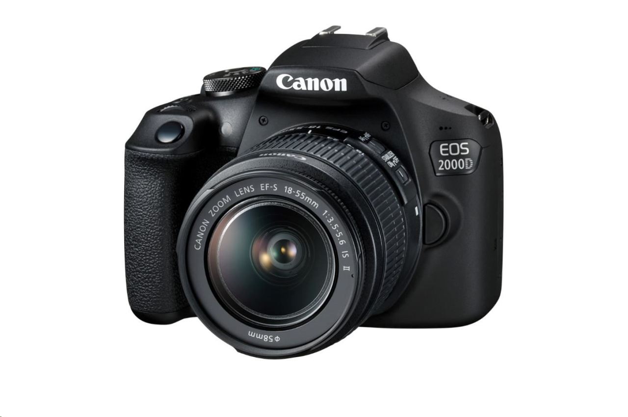 CANON EOS 2000D.Fotoaparát Canon EOS 2000D je díky jednoduchému a intuitivnímu ovládání ideální první zrcadlovkou, která zachytí vaše vzpomínky s krásným rozostřeným pozadím, abyste je poté mohli snadno sdílet.Pusťte se do nenáročného vyprávění příběhů s digitální zrcadlovkou.Pomocí 24,1megapixelového fotoaparátu EOS 2000D snadno pořizujte fotografie v kvalitě digitální zrcadlovky a natáčejte videa v rozlišení filmové kvality Full HD, a to i v obtížných, špatně osvětlených situacích. Snímky můžete okamžitě sdílet a pořizovat dálkově pomocí možností připojení přes Wi-Fi, NFC a aplikaci Canon Connect.Snadná kreativita.Vyzkoušejte instruované snímání s živým náhledem v Kreativním automatickém režimu a pomocí kreativních filtrů dodejte snímkům jedinečný výsledný vzhled. S Automatickým inteligentním scénickým režimem stačí zaměřit a stisknout spoušť.Nechte každodenní momenty ožít s fotoaparátem EOS 2000D.Vytvářejte ze spontánních momentů kreativní videa v rozlišení Full HD nebo použijte funkci Videomomentka ke snadnému zachycení nejlepších momentů svého dne.Fotografujte s jistotou.Přesné automatické zaostření, rychlost 3 sn./s a procesor DIGIC 4+ vám umožní zachytit daný okamžik právě tak, jak si ho pamatujete. Užívejte si snadného nastavení kompozice s optickým hledáčkem a prohlédněte si výsledky na 7,5cm displeji LCD.Objevte možnosti digitální zrcadlovky.Snadného průvodce fotografováním s digitální zrcadlovkou najdete v aplikaci Canon Photo Companion (ke stažení pro systém Android a iOS). Až budete připraveni, přidejte další objektivy a příslušenství, nebo vezměte ovládání fotoaparátu do svých rukou.Objektiv EF-S 18-55mm f/3.5-5.6 IS II.Kompaktní a cenově dostupný model EF-S 18–55 mm f/3,5–5,6 IS II je ideální univerzální standardní objektiv se zoomem. Jeho stabilizátor obrazu s rozsahem 4 EV poskytuje vynikající výkon za slabého osvětlení.Výhody.