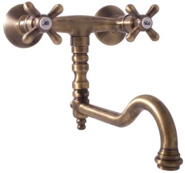 Kohoutková nástěnná DŘEZOVÁ BATERIE s otočným ramínkem. V provedení stará mosaz. Rozteč baterie 150 mm.