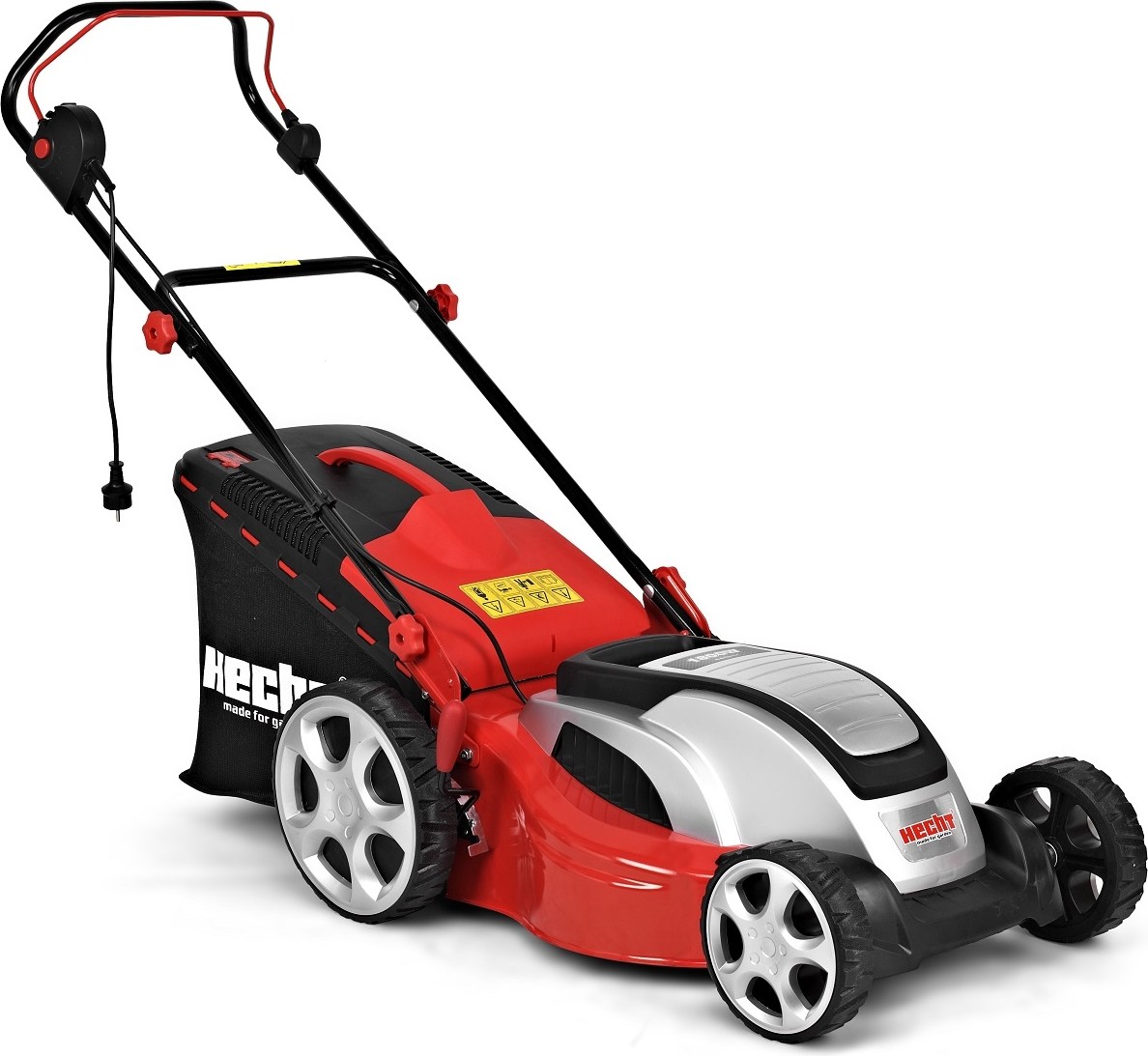 Výhody:.kvalitný silný výkonný motor 1800 W.kvalitný kovový skelet.veľké kolesá vpredu 8" a vzadu 11" s patentovaným W dizajnom, pre ľahkú manévrovateľnosť na trávniku.mulčovacia záslepka zadarmo v základnej výbave.centrálne nastavenie všetkých koliesok.prevod otáčok pomocou malého klinového remeňa výrazne zvyšuje krútiaci moment stroja (Turbo motor) a pri náraze noža na prekážku zabráni spáleniu motora a tým pádom aj drahej oprave.užívateľsky prívetivá a veľmi jednoduchá obsluha.elegantný a nadčasový dizajn.ergonomický tvar riadidiel pre maximálny komfort pri práci.rýchlo zložiteľné a rozložiteľné riadidlá pre ľahký transport.veľký moderný plastovo-textilný kôš 50 l s pohodlným držadlom a indikátorom naplnenia.veľké madlo na kryte motora pre jednoduché prenášanie kosačky.HECHT 1845 je elektrická rotačná kosačka bez pojazdu, ktorej základom je poctivý kovový skelet, ktorý má nielen dostatočnú tuhosť, ale obsluhe zaistí i dostatočnú ochranu od prípadných predmetov odhodených náhodne nožom kosačky. Ako pohon pre 46 cm oceľové nože kosačky je tu použitý elektrický "TURBO motor" s vysokým krútiacim momentom s príkonom 1800 W,, ktorý poskytuje dostatok sily pre pracovný záber 460 mm. Nastavenie výšky kosenia sa vykonáva centrálne jedinou pákou v rozsahu od 30 - 75 mm. Cez masívne spracovanie si kosačka udržala pomerne príjemnú hmotnosť 23,8 kg. Tieto parametre predurčujú kosačku pre pravidelné kosenie pozemkov s doporučenou plochou až 1000 m2.U kosačky tejto triedy je už samozrejmosťou madlo s možnosťou pohodlného zloženia. Veľkou výhodou je i páka spínača motora, ktorá je vedená po celej šírke madla. Vďaka tomu je možné viesť kosačku ľubovoľnou rukou a druhú ruku využiť napríklad k bezpečnej manipulácii s prívodným káblom. Samozrejmosťou je i bezpečnostné tlačidlo proti náhodnému spusteniu a odľahčovač pnutia kábla.Priestranný 60 l kôš je vybavený mechanickou signalizáciou stavu naplnenia. Kôš je v zadnej časti opatrený malou záklopkou, ktorá je zdvíhaná prúdom vzduchu od rotora kosačky. Vďaka zmene prúdenia v závislosti na stave naplnenia koša táto záklopka mení svoju polohu a obsluha tak má neustály prehľad o stave koša.Zaujímavou vlastnosťou je tzv. funkcia "EDGE CUTTING". Vďaka šikovne tvarovanému skeletu kosačky pri kosení pozdĺž múrikov a plotov dosahujú nože takmer až na samý okraj trávnika. Konečná úprava trávnika po kosení napríklad pomocou vhodného vyžínača je potom znateľne jednoduchšia a rýchlejšia a v mnohých prípadoch už konečná úprava je nie vôbec potrebná.Táto kosačka je vybavená funkciou "MULČOVANIE". Doplnkom v cene kosačky je mulčovacia sada, ktorá zaslepí vyhadzovací otvor skeletu do koša a vďaka špeciálnej konštrukcii noža potom dochádza k drobnému posekaniu trávy. Tieto zvyšky potom prepadnú ku koreňom, kde tlejú a slúžia ako prirodzené hnojivo. Zaujímavosťou je, že tento mulč nezanesie trávu plsťou, naopak ju chráni pred stratou vlhkosti čím podporí jej zdravý rast.Vďaka použitiu elektrického pohonu je ovládanie kosačky naozaj jednoduché. Nevýhoda nutnosti napájacieho kábla je podstatne vyvážená jednoduchým spúšťaním, obsluhou a v porovnaní so spaľovacími motormi i oveľa jednoduchšou údržbou, čo mnohonásobne znižuje prevádzkové náklady.Texty uvádzané ako popis funkcií produktov v žiadnom prípade neslúžia ako návod na použitie. Pri používaní prosím postupujte v súlade s užívateľským manuálom, ktorý je súčasťou dodávky produktu.Parametre.skelet.kovový.záber (cm).46.hmotnosť (kg).23,8.kôš (l).60.doporučená plocha (m2).1000.nastavenie výšky (mm).30 - 75.centrálne nastavenie výšky kosen.áno.guličkové ložiská.áno.edge cutting.áno.pojazd.nie.príkon (W).1800.
