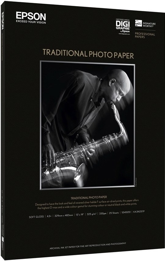 Epson Traditional Photo Paper predstavuje prelom vo výrobe papiera. Bol navrhnutý špeciálne pre použitie s atramentom Epson UltraChrome K3, a to v spolupráci s mnohými čelnými profesionálnymi fotografmi tak, aby bez zbytku splnil ich vysoké nároky. Mnohí, ktorí sa na vývoji foto papiera Traditional Photo Paper podieľali, zdôraznili, že im pripomína klasické halogenidostrieborné média a zároveň ponúka viac kreatívnej kontroly vďaka mimoriadnej optické hustote a reprodukcii odtieňov v čierno bielej. Okrem toho môžu na tom samom papieri tlačiť vo vynikajúcich farbách, čo na tradičných vláknitých papieroch nebolo možné.V kombinácii umeleckej formy tradičnej fotografie a ľahkého spracovania a obsluhy digitálneho výstupu prináša toto jedinečné médium rovnako hlboké čierne tóny, jemné prechody a trvanlivé výsledky ako za časov papierov vyvolávaných v temných komorách. Jeho vláknitý základ zdobí plný povrch, rovnomerná hĺbka farieb a mäkký lesk, vďaka ktorým je ideálny ako pre skutočne vybranú reprodukciu farieb, tak pre tlač v neutrálnej čierno bielej pri zachovaní vzhľadu a pôvabu tradičných vláknitých papierov. Rovnako ako ostatné inovativne média Epson je aj tento papier navrhnutý a vyrobený tak, aby vám ponúkol najvyššie možné rozlíšenie a sýtosť farieb. Spotrebné materiály Epson sú vždy zárukou preverenej kvality Epson.