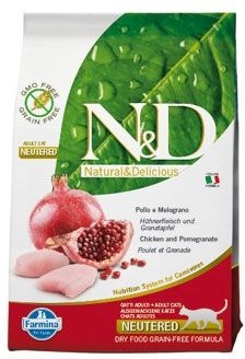 Kompletné superprémiové krmivo N&D Grain Free CAT Neutered Chicken & Pomegranate je vhodné pre dospelé kastrované mačky. Vďaka starostlivo vyberaným surovinám a netradičným chutiam sa k Vašej mačke dostanú iba tie najkvalitnejšie potraviny a živiny. Navyše prinesie Vašej mačke kúsok z divočiny. Krmivo obsahuje tie najkvalitnejšie bielkoviny z kuracieho mäsa, veľa ovocia, zeleniny a bylinné extrakty. To všetko spolu prinesie Vášmu zvieraťu to najlepšie pre zdravý a spokojný život.Vďaka technológii efektívnej extrakcie vitamínov sú vitamíny získané z ovocia a zeleniny extrakciou dlhšie čerstvé a počas produkcie nenastáva ich znehodnotenie.Nový inovatívny rad suchých krmív N&D Grain Free pre mačky, je založený na šiestich kľúčových princípoch výživy mäsožravých zvierat:.Nízky glykemický index, nízky obsah sacharidov.Bohatý zdroj proteínov z vysoko kvalitných zdrojov mäsa.Správne vyvážený pomer vitamínov a minerálov z kvalitného ovocia a zeleniny.Liečivé rastliny so špecifickými vlastnosťami pre cielený efekt.Ľahko stráviteľné živočíšne tuky.Absencia komplexných obilnín, jediné použité obilniny v niektorých receptúrach majú nižší glykemický komplex a nie sú geneticky modifikované.Zloženie: Čerstvé vykostené kura (30%), sušené kuracie mäso (28%), zemiaky, kurací tuk, sušené celé vajcia, čerstvý herring, sušený herring, rybí olej, hydrolyzované živočíšne bielkoviny, vláknina z hrášku, sušené mrkvy, sušená lucerna, inulín, fruktooligosacharidy, mannanoligosacharidy, prášok z granátových jabĺk (0.5%), sušené jablká, prášok zo špenátu, psyllium (0.3%), prášok z čiernych ríbezlí, sušený sladký pomaranč, prášok z čučoriedok, chlorid sodný, sušené pivovarské kvasnice, koreň kurkumy (0.2%), glukosamín, chondroitín sulfát, extrakt z afrikánu (zdroj luteínu). Aditíva na 1kg - Výživové prísady: Vitamín A 18000MJ; Vitamín D3 1200MJ; Vitamín E 600mg; Vitamín C 300mg; Niacín 150mg; kyselina pantoténová 50mg; Vitamín B2 20mg; Vitamín B6 8.1mg; Vitamín B1 10mg; Vitamín H 1.5mg; kyselina listová 1.5mg; Vitamín B12 0.1mg; cholín 2800mg; betakarotén 1.5mg; chelát zinku analogické metioninové hydrolázy 910mg; chelát mangánu analogické metioninové hydrolázy 380mg; chelát železa analogické metioninové hydrolázy 250mg; chelát medi analogické metioninové hydrolázy 88mg; selenometionin 0.4mg; DL-Metionín 5000mg; taurín 5000mg; L-karnitín 400mg. Organoleptické prísady: Extrakt z aloe vera 1000mg; extrakt zo zeleného čaju 100mg; extrakt z rozmarínu. Antioxidanty: tokoferol - bohaté výťažky prírodného pôvodu. Analytické zložky: Hrubý proteín 46.00%; čisté tuky a oleje 11.00%; Vláknina 5.10%; popol 8.90%; vápnik 1.50%; fosfor 1.30%; horčík 0.09%; Omega-6 2.00%; Omega-3 0.45%; DHA 0.30%; EPA 0.10%; glukosamín 1200mg / kg; chondroitín 900mg / kg. Energetická hodnota: ME 3350kcal / kg - 14MJ / kg.