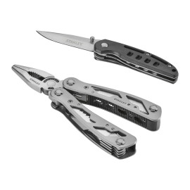 Funkce nástroje: univerzální kleště s vroubkovanými čelistmi, v čelistech integrované ostří na stříhání drátů, pilka, malý nůž, velký nůž, otvírák na konzervy, kleště s oblými čelistmi, 3; 6 a 8mm plochý šroubovák, křížový šroubovák Phillips a pilník Čepele vyrobeny z nerezové oceli .