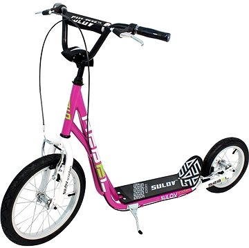Koloběžka Sulov Rebel 16"/12" - fialová/bílá.Koloběžka SULOV REBEL 16"-12" je všestranná koloběžka pro dospívající děti i dospělé. Konstrukčně velmi stabilní a rychlá. X rám zvětšuje prostor pro kolena. Větší kolo vpředu a menší vzadu zabezpečuje slušnou cestovní rychlost a zároveň obratnost. Výškově nastavitelná řidítka a ergonomické gripy přispívají ke zvýšení pohodlí. Dvě Alu-V brzdy zajišťují bezpečné brzdění.Specifikace:.