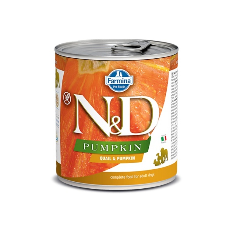 N&D Pumpkin Receptura pro psy Quail& Pumpkin Adult Křepelka a dýně. Kompletní vlhké krmivo pro dospělé psy. Složení: Křepelčí filet (30%), kuřecí filet, kuřecí paličky, dýně (5%), rybí olej, živočišný tuk, rýže parboiled, fruktooligosacharidy, chondroitin sulfát, glukosamin, vitamíny, minerály. Doplňkové látky na 1 kg – Nutriční doplňkové látky: Vitamín A 4000IU; Vitamín D3 400IU; Vitamín E 130mg; Cholin chlorid 400mg; Zinek (chelát zinku hydroxy analogu methioninu): 36mg; Mangan (chelát manganu hydroxy analogu methioninu): 6.8mg; Železo (chelátová forma Železa(II), hydrát): 16.8mg; Měď (chelát mědi hydroxy analogu methioninu): 2.9mg; Selen (inaktivované kvasinky obohacené selenem): 0.00242mg; DL-Metionin, technicky čistý 1000mg; Taurin 500mg; L-Karnitin 50mg. Analytické složky: Vlhkost 75.00%; hrubý protein 12.00%; hrubý tuk 4.50%; hrubá vláknina 1.00%; hrubý popel 2.40%.