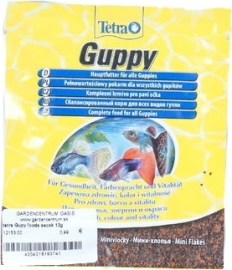 TETRA Guppy sáčok 12g - Základné krmivo pre pávie očká, halančíky a ostatné živorodky. - Kompletné krmivo pre pávie očká, halančíky a živorodky.Zvýrazňuje prírodné sfarbenie a zabezpečuje vitalitu. Obsahuje prírodné rozjasňovače farieb, ktoré sa nachádzajú pri kreviet a riasy spirulina.Kŕmny návod: kŕmte toľko, koľko ryby spotrebujú behom niekoľkých minút.Zloženie: ryby a vedľajšie výrobky z rýb, obilniny, kvasnice, bielkovinové extrakty rastlinného pôvodu, mäkkýše a kôrovce, oleje a tuky, cukry, lecitín.Akostné znaky: hrubé proteíny 47,5%, vlhkosť 6%, oleje a tuky 8%, hrubé popoloviny 10,5%, vláknina 2%, vitamín A 11520 mj / kg, vitamín D3 600 mj / kg, vitamín E ( alfatokoferol) 38 mg / kg, L-askorbyl-2-polyfosforečnan (stabilizovaný vitamín C) 132 mg / kg.