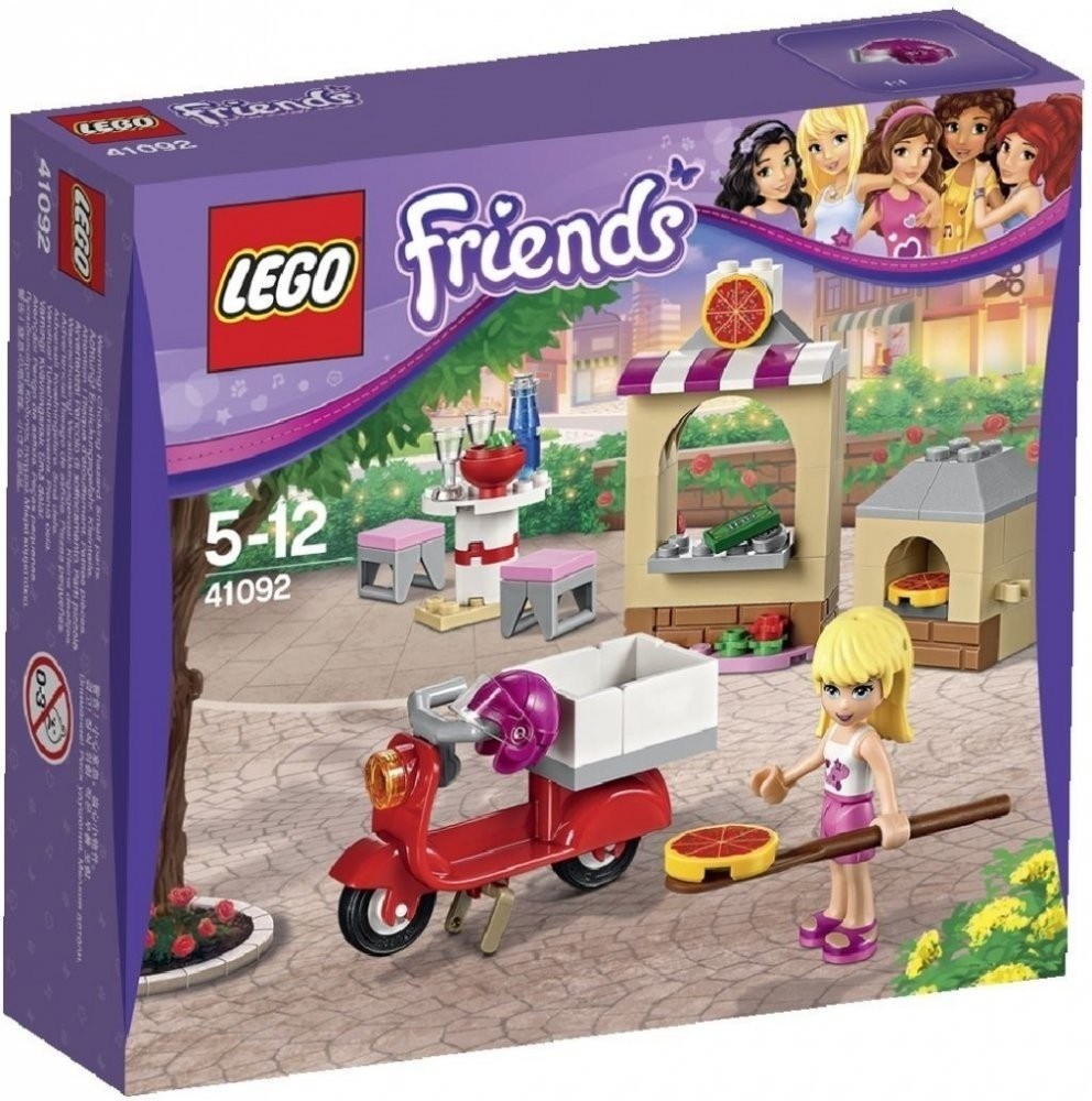 Stavebnice 87 dílků, doporučený věk od 5 - 12 let Stavebnice LEGO Friends 41092 Pizzerie Stephanie je určena pro děti od 5 do 12 let. Skládá se z mnoha zajímavých částí, které po sestavení vytvoří pizzerii pro malé milovníky pizzy. Obsahuje pec, ve které se připravuji ty nejlepší pizzy v okolí, restaurační stolek, skleničky s nádobím a dvěmi nezbytnými židlemi ke stolku. Samozřejmostí je pult, u kterého se přijímají objednávky a za kterým se pizza připravuje. Velmi důležitý je i telefon za pultem. Jak by bez něj mohla pizzerie fungovat, pokud by se nedaly dělat telefonické objednávky! A protože se jedná o pizzerii s donáškou do domu, nechybí ani skútr i s termoboxem, ve kterém se pizza rozváží. Nejdůležitější je ale samotná hlavní postavička, která zde šéfuje, prodává, uklízí, obsluhuje a především rozváží pizzu. Tou šikovnou a velmi rychlou postavičkou je mini panenka Stephanie.Pizzerie Stephanie je v centru městečka Heartlake u hlavní třídy. Vaše holčička s.