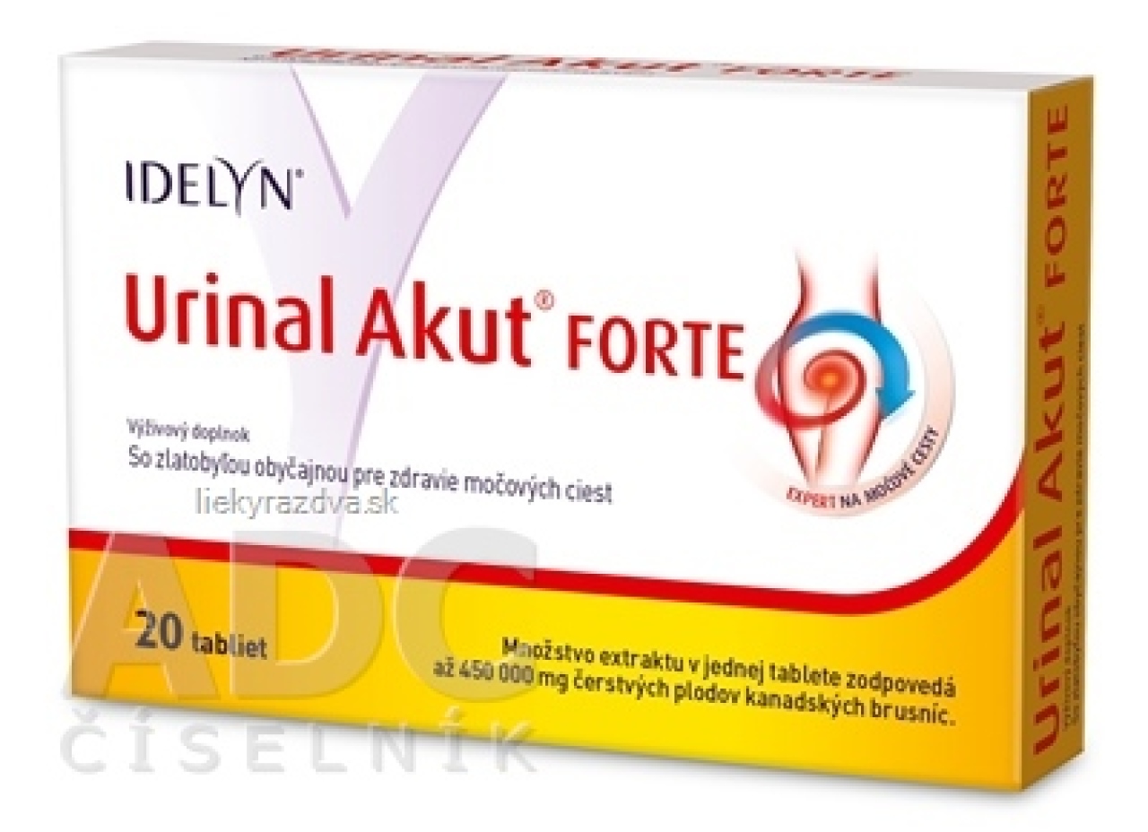 Urinal Akut® obsahuje tri látky - CystiCran®, vysoko koncentrovaný extrakt z kanadských brusníc – kľukva veľkoplodá (Vaccinium macrocarpon), extrakt zo zlatobyle obyčajnej (Solidago virgaurea) a vitamín D. Kanadské brusnice sú bohatým zdrojom bioflavonoidov, fenolických zlúčenín a iných prírodných látok. Množstvo extraktu v jednej tablete zodpovedá až 450 000 mg čerstvých plodov kanadských brusníc. Urinal Akut® obsahuje garantované množstvo proantokyanidínov. Unikátna technológia spracovania kanadských brusníc vo forme extraktov CystiCran® zaisťuje kvalitu a obsah účinných látok.Denná dávka obsahuje: hmot./ 1 tob. % RVH* CystiCran®(Vaccinium macrocarpon extrakt z plodov) (štandardizované na 40 % proantokyanidínov, ekviv. až 450 000 mg plodov kanadských brusníc) 90,0 mg 36,0 mg - Zlatobyľ obyčajná (Solidago virgaurea sušená rastlina) (extrakt z celej rastliny min. 10:1- 20 mg) 200,0 mg - Vitamín D 5,0 mcg 100.% referenčnej výživovej hodnoty v 1 tablete; - nie je stanovené.Vitamín D podporuje správnu funkciu imunitného systému. Spôsob použitiaVýživový doplnok sa odporúča užívať v množtstve 1 tableta denne. Tableta sa užije vcelku a zapije dostatočným množstvom tekutiny.Upozornenie: Nevhodné pre deti do 12 rokov. Neprekračujte ustanovenú dennú dávku. Nesmie sa používať ako náhrada pestrej stravy. Skladujte mimo dosahu detí, v suchu a tme, pri teplote do 25°C. Uchovávať v pôvodnom neporušenom vnútornom obale.