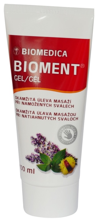 Bioment masážní gel 100ml Bioment gel je tradiční a našimi zákazníky velmi oblíbený masážní přípravek. Masážní gel obsahuje kombinaci 5 přírodních éterických olejů a vysoký podíl extraktu z kaštanu koňského.