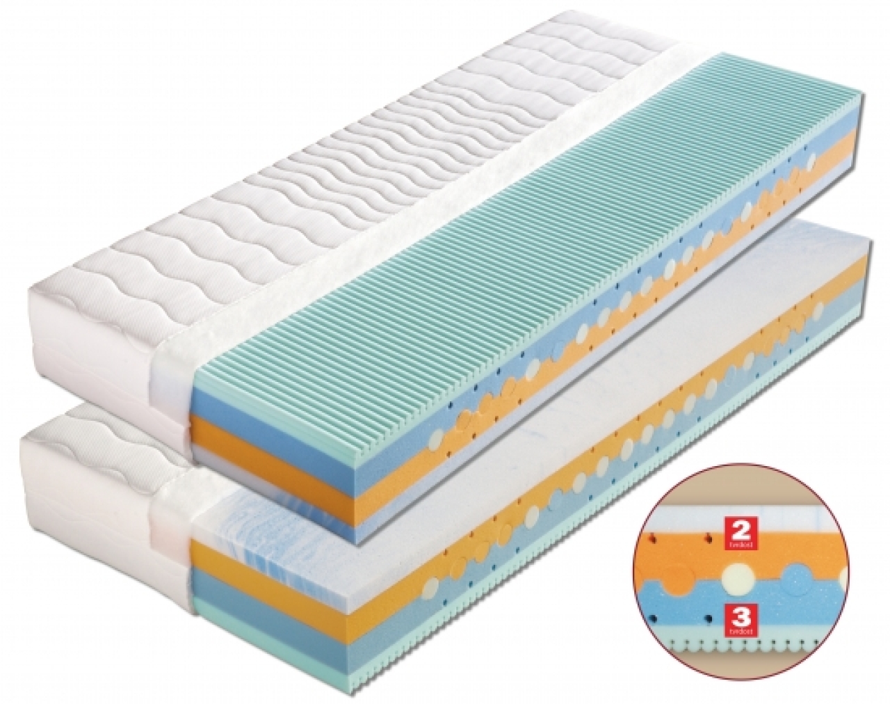 Kvalitní oboustranná matrace tvořena perforovaným jádrem ze studené pěny dvou tvrdostí s vloženými válci ze studených pěn různých tuhostí. Nosné vrstvy tvoří speciálně profilovaná masážní vrstva s panáčky, která zabezpečuje dokonalé prokrvení pokožky a uvolňuje svaly v průběhu spánku. Druhou nosnou vrstvu tvoří extrémně prodyšná studená / HR pěna se změkčujícím efektem a příjemně hladkým, nebeským povrchem. Matraci je vhodné položit na pevný nebo polohovací lamelový rošt.Celková výška matrace je cca 23 cm.Nosnost:  do 120 kgTuhost :  středně tvrdá (2) tvrdá (3)Počet zón: 7Klinicky testovánoPotah matrace je snímatelný.Matrace se vyrábí v rozměrech: 80x195 cm, 85x195 cm, 80x200 cm, 90x200 cm, 140x200 cm, 160x200 cm, 180x200cm.Potah + rozměr matrace prosím vyberte ve variantách produktu.Výběr potahů matrace:Úplet:Vyšší stupeň kvality v porovnání s froté potahem. Povrch je hladší a silnější. Je prošitý dutým vláknem s vyšší gramáží. Tímto způsobem dosáhneme lepší izolace od jádra matrace. Tento potah je prošitý třízónovým způsobem (střed - hustší prošití).Aloe Vera:Kvalitní potah, který obsahuje výtažek známé rostliny Aloe Vera Barbaensis z rodu liliovitých. Má pozitivní vliv na pokožku lidského těla, působí antibakteriálně. Postupně se uvolňující extrakt z AloeVera umožňuje dokonalou relaxaci ve spánku. Potah, prošitý třízónovým způsobem, je příjemný na dotek a standartně vetkané logo zaručuje nezaměnitelnost výrobkuSilverGuard:SilverGuard je jedinečná technologie, která zaručuje trvalou svěžest a hygienu během spánku. Eliminuje bakterie způsobující zápach a chrání před jejich usazováním. Ochrana je trvalá i po častém praní a čištění. Při kontaktu s pokožkou zachovává její přirozenou rovnováhu. Tento potah obsahuje přírodní viskózové vlákno, které ve spojení s moderním designem dodává textilii luxusní charakter. Zaručuje vám absolutní čistotu a pohodlí. SilverGuard® úprava: Využívá stříbro jako jeden z nejstarších a nejznámějších způsobů ochrany před houbami a bakteriemi. Díky působení stříbrných iontů chrání textilii před mikroorganismy a zabraňuje jejich rozvoji přírodní cestou. SilverGuard® zajišťuje konstantní svěžest a hygienu lůžka, vysokou odolnost proti oděru a žmolkování. Potah je pratelný na 60°C. Složení potahu: 35% VISKÓZA, 2% POLYAMID, 63% POLYESTER.Medicott:Značkový typ pleteného potahu svým speciálním složením zabraňuje tvorbě a usazování domácích roztočů a tvorbu plísní má vynikající antibakteriální účinky, které jsou dosaženy bez přídavku chemických látek. Tajemství úspěšného fungování spočívá v odstranění nečistot z vláken přírodní bavlny, čímž se zamezí potencionálnímu domovu plísní. Medicott má dlouhotrvající účinek při pravidelné údržbě. Potah je možno prát při 60° C.Lyocell:Materiál z čistého přírodního vlákna získaného ze dřeva technologií šetřící životní prostředí.Se všemi svými vynikajícími charakteristikami Vám poskytuje během spánku optimální pohodlí. K jejím předním vlastnostem patří vysoká absorpční schopnost a velmi rychlé odpařování. Tyto vlastnosti zaručují dokonalý pocit i pro osoby s vyšší potivostí. Mikrovlákna Lenzing Lyocell dodávají látce hedvábný lesk a jsou odolná a necitlivá k mikroorganismům. Potah je možno prát při 60° C.
