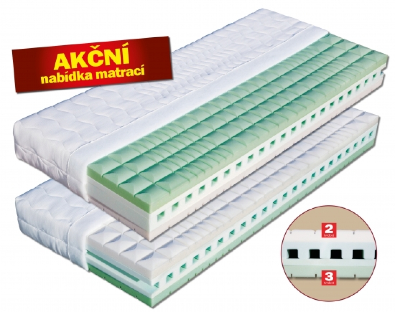 Jádro této pevné matrace tvoří tvrzená polyuretanová pěna s příčným profilováním, která zajišťuje vzdušnost. Nosné vrstvy jsou tvořeny dvěma elastickými MediFoam pěnami rozdílných tuhostí. Jejich antidekubitní průřez zaručí dokonalé kopírování těla a vytváří pevnou oporu páteře v její přirozené poloze. Matrace je vhodná na všechny typy lamelových roštů i na pevnou desku. Výška matrace cca 23 cm. Tuhost:  střední (2) a tvrdá (3)Nosnost: do 130 kgPočet zón: 7Potah matrace je snímatelný.Matrace se vyrábí v těchto rozměrech: 80x195, 85x195, 80x200, 90x200 cm, 140x200, 160x200 a 180x200 cm.Potah + rozměr matrace prosím vyberte ve variantách produktu.Úplet:Vyšší stupeň kvality v porovnání s froté potahem. Povrch je hladší a silnější. Je prošitý dutým vláknem s vyšší gramáží. Tímto způsobem dosáhneme lepší izolace od jádra matrace. Tento potah je prošitý třízónovým způsobem (střed - hustší prošití).Aloe Vera:Kvalitní potah, který obsahuje výtažek známé rostliny Aloe Vera Barbaensis z rodu liliovitých. Má pozitivní vliv na pokožku lidského těla, působí antibakteriálně. Postupně se uvolňující extrakt z AloeVera umožňuje dokonalou relaxaci ve spánku. Potah, prošitý třízónovým způsobem, je příjemný na dotek a standartně vetkané logo zaručuje nezaměnitelnost výrobkuSilverGuard:SilverGuard je jedinečná technologie, která zaručuje trvalou svěžest a hygienu během spánku. Eliminuje bakterie způsobující zápach a chrání před jejich usazováním. Ochrana je trvalá i po častém praní a čištění. Při kontaktu s pokožkou zachovává její přirozenou rovnováhu. Tento potah obsahuje přírodní viskózové vlákno, které ve spojení s moderním designem dodává textilii luxusní charakter. Zaručuje vám absolutní čistotu a pohodlí. SilverGuard® úprava: Využívá stříbro jako jeden z nejstarších a nejznámějších způsobů ochrany před houbami a bakteriemi. Díky působení stříbrných iontů chrání textilii před mikroorganismy a zabraňuje jejich rozvoji přírodní cestou. SilverGuard® zajišťuje konstantní svěžest a hygienu lůžka, vysokou odolnost proti oděru a žmolkování. Potah je pratelný na 60°C. Složení potahu: 35% VISKÓZA, 2% POLYAMID, 63% POLYESTER.Medicott:Značkový typ pleteného potahu svým speciálním složením zabraňuje tvorbě a usazování domácích roztočů a tvorbu plísní má vynikající antibakteriální účinky, které jsou dosaženy bez přídavku chemických látek. Tajemství úspěšného fungování spočívá v odstranění nečistot z vláken přírodní bavlny, čímž se zamezí potencionálnímu domovu plísní. Medicott má dlouhotrvající účinek při pravidelné údržbě. Potah je možno prát při 60° C.Lyocell:Materiál z čistého přírodního vlákna získaného ze dřeva technologií šetřící životní prostředí.Se všemi svými vynikajícími charakteristikami Vám poskytuje během spánku optimální pohodlí. K jejím předním vlastnostem patří vysoká absorpční schopnost a velmi rychlé odpařování. Tyto vlastnosti zaručují dokonalý pocit i pro osoby s vyšší potivostí. Mikrovlákna Lenzing Lyocell dodávají látce hedvábný lesk a jsou odolná a necitlivá k mikroorganismům. Potah je možno prát při 60° C.