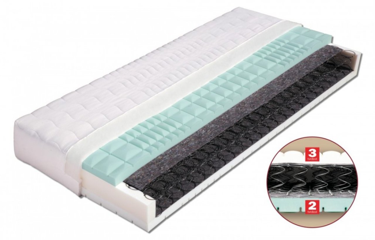 Velmi kvalitní pružinová matrace PETRA vrstvená elastickými pěnami MediFoam různých objemových hmotností, rozdělených do 7 anatomických zón s antidekubitním průřezem. Výška jádra poskytuje uživateli komfort, pevnou anatomickou oporu a zároveň zajišťuje vysokou vzdušnost matrace. Matrace jsou zejména vhodné pro ubytovací zařízení, především tam, kde je potřeba docílit vysokého provzdušnění. Výška matrace cca 24 cm. Tuhost: 2 a 3 (střední a tvrdá)Nosnost: 130 kgPočet zón: 7Potah matrace je snímatelný a pratelný 60 °C. Matrace je vhodná na všechny typy námi nabízených roštů a může být uložena i na pevný podklad. Matrace se vyrábí v rozměrech: 195x80, 195x85, 200x80, 200x90, 200x140, 200x160, 200x180 cm.Potah + rozměr matrace prosím vyberte ve variantách produktu.Úplet:Vyšší stupeň kvality v porovnání s froté potahem. Povrch je hladší a silnější. Je prošitý dutým vláknem s vyšší gramáží. Tímto způsobem dosáhneme lepší izolace od jádra matrace. Tento potah je prošitý třízónovým způsobem (střed - hustší prošití).Aloe Vera:Kvalitní potah, který obsahuje výtažek známé rostliny Aloe Vera Barbaensis z rodu liliovitých. Má pozitivní vliv na pokožku lidského těla, působí antibakteriálně. Postupně se uvolňující extrakt z AloeVera umožňuje dokonalou relaxaci ve spánku. Potah, prošitý třízónovým způsobem, je příjemný na dotek a standartně vetkané logo zaručuje nezaměnitelnost výrobkuSilverGuard:SilverGuard je jedinečná technologie, která zaručuje trvalou svěžest a hygienu během spánku. Eliminuje bakterie způsobující zápach a chrání před jejich usazováním. Ochrana je trvalá i po častém praní a čištění. Při kontaktu s pokožkou zachovává její přirozenou rovnováhu. Tento potah obsahuje přírodní viskózové vlákno, které ve spojení s moderním designem dodává textilii luxusní charakter. Zaručuje vám absolutní čistotu a pohodlí. SilverGuard® úprava: Využívá stříbro jako jeden z nejstarších a nejznámějších způsobů ochrany před houbami a bakteriemi. Díky působení stříbrných iontů chrání textilii před mikroorganismy a zabraňuje jejich rozvoji přírodní cestou. SilverGuard® zajišťuje konstantní svěžest a hygienu lůžka, vysokou odolnost proti oděru a žmolkování. Potah je pratelný na 60°C. Složení potahu: 35% VISKÓZA, 2% POLYAMID, 63% POLYESTER.Medicott:Značkový typ pleteného potahu svým speciálním složením zabraňuje tvorbě a usazování domácích roztočů a tvorbu plísní má vynikající antibakteriální účinky, které jsou dosaženy bez přídavku chemických látek. Tajemství úspěšného fungování spočívá v odstranění nečistot z vláken přírodní bavlny, čímž se zamezí potencionálnímu domovu plísní. Medicott má dlouhotrvající účinek při pravidelné údržbě. Potah je možno prát při 60° C.Lyocell:Materiál z čistého přírodního vlákna získaného ze dřeva technologií šetřící životní prostředí.Se všemi svými vynikajícími charakteristikami Vám poskytuje během spánku optimální pohodlí. K jejím předním vlastnostem patří vysoká absorpční schopnost a velmi rychlé odpařování. Tyto vlastnosti zaručují dokonalý pocit i pro osoby s vyšší potivostí. Mikrovlákna Lenzing Lyocell dodávají látce hedvábný lesk a jsou odolná a necitlivá k mikroorganismům. Potah je možno prát při 60° C.