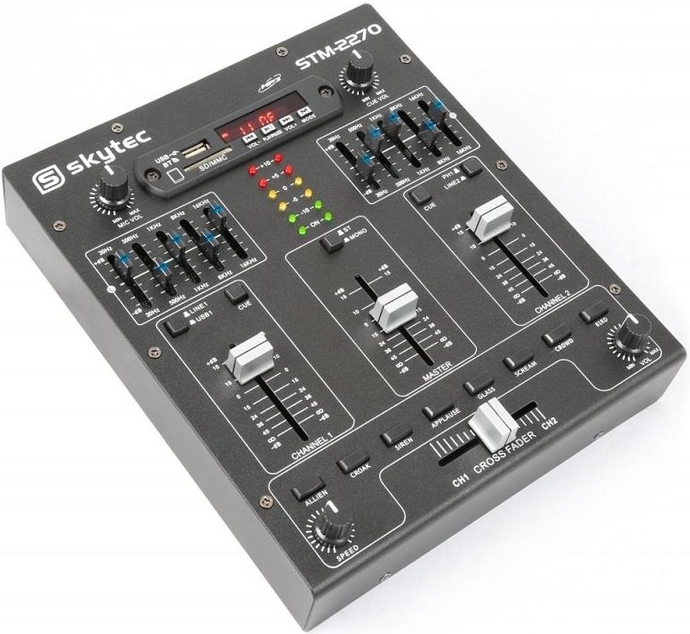 Zariadenie Skytec STM-2270 je dostupný 4-kanálový mix ér, ktorý slúži laickým a pri malých koncertoch. DJ mixér ponúka možnosti pripojenia pre všetky bežné audio zdroje – napríklad gramofóny, CD prehrávače a počítače. Možnosť pripojení mixéru je doplnená USB portom, cez ktorý možno prehrávať skladby vo formáte MP3 priamo z pamäťových nosičov, ako sú USB kľúče a MP3 prehrávače. K najdôležitejšiemu patrí integrované bluetooth rozhranie, ktoré umožňuje bezdrôtové streamovanie hudby z bluetooth zariadení ako smartfóny, tablety, laptopy a počítače. Rozsah funkcií ukončuje slot pre SD pamäťové karty. Funkcia náhľadu dáva účinnú kontrolu nad aktuálnymi skladbami, zatiaľ čo 5-pásmový ekvalizér umožňuje zlepšenie nerovnosti signálov. Ďalšou zvláštnosťou je 8 prispôsobiteľných zvukových efektov, ktorými môžete dopĺňať menšie zvukové kulisy, ako sú potlesk, cvrlikanie vtákov a výkriky. Mikrofónový vstup umožňuje použitie na podujatiach, v ktorých treba nahrať reč a spev. S crossfadingom, kanálovým fadingom sú pripravené všetky funkcie pre zriadenie malého DJ setu. Jeho pevná kovová konštrukcia si vás okrem kompaktných rozmerov získa svojim prehľadným usporiadaním.