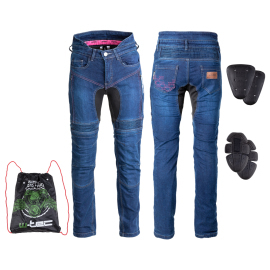 Dámské moto jeansy W-TEC Biterillo Lady jsou komfortní denimové kalhoty na motorku s mnoha funkčními vlastnostmi. Díky anatomickému tvaru a příměsi elastického vlákna se dokonale snoubí s proporcemi dámského těla a budou tak lichotit Vaší postavě. Praktický střih kalhot je prezentován pomocí vyššího pasu, především pak v oblasti beder. Vysokou míru pohodlí si můžete užít díky mnoha strečovým panelům. Pro vyšší bezpečnost a ochranu jezdce disponují vyztužením z aramidového vlákna (DuPont Kevlaru) na strategických místech. Tento materiál je velmi tuhý a chrání látku proti nárazům a oděrům.Dále jsou kalhoty vybaveny vyjímatelnými chrániči boků a kolen s velkou plochou, čímž je ještě zvýšen stupeň bezpečnosti. Ty kolenní lze jednoduše vkládat zvenku, tudíž se nemusíte obávat jejich zdlouhavé výměny nebo dokonce obracení kalhot naruby. K tomu jsou navíc ještě výškově nastavitelné, takže jistě padnou každému. Po vyjmutí protektorů lze jeansy bez jakéhokoliv problému používat i jako normální kalhoty ke každodennímu nošení.Velké množství kapes je možno využít jako praktický úložný prostor pro drobnosti. Design kalhot pak doplňuje kontrastní prošívání na stehnech, loga a vnitřní dekorativní lem W-TEC. Dámské moto jeansy W-TEC Biterillo Lady jsou ideální kombinací bezpečnosti, pohodlí a stylu. Díky jejich vlastnostem je lze nosit jak na jaře a na podzim, tak díky nastavitelné ventilaci i během horkých letních dnů.Technický popis:.vysoký pas v bederní oblasti.strečové panely v oblasti beder a kolen.elastický materiál v oblasti třísel a na vnitřní straně stehen.dlouhé uzavíratelné ventilační otvory na oblasti stehen.vyztužení aramidovým vláknem (Kevlarem) po cca 60% délky.podšívka z jemné síťoviny.vyjímatelné CE chrániče Safe Max (Type B - s velkou plochou dopadu) v oblasti boků.z vnějšku vyjímatelné CE kolenní chrániče (Type B - s velkou plochou dopadu) s možností výškového nastavení.2 přední kapsy, 1 přední kapsička, 2 zadní kapsy.poutka na pásek.kontrastní prošívání na vybraných částech.materiál: vnější 11,5 oz bavlněný denim (98%), elastan (2%); vnitřní aramidové vlákno (DuPont Kevlar).lze prát v pračce.ideální od jara do podzimu.vhodné i pro horké letní dny.po vyjmutí chráničů možnost běžného každodenního použití.transportní vak s poutky součástí balení.Velikostní tabulka (rozměry kalhot):.Obvod pasu (cm).Obvod boků (cm).Celková délka (cm).Délka od rozkroku (cm).XS.70.90.107.78.S.74.94.107.79.M.78.97.107.80.L.82.100.108.81.XL.86.103.108.82.XXL.90.106.109.83.3XL.94.109.109.84.4XL.98.112.110.85.5XL.102.115.111.86.