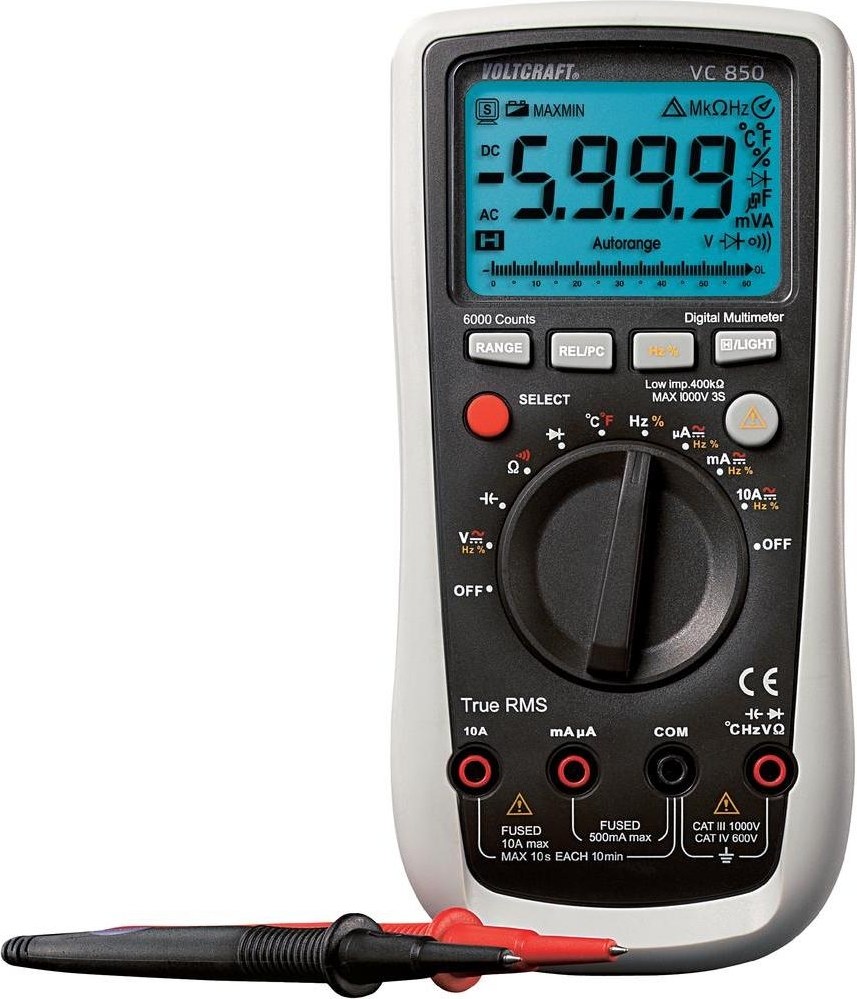 Nová střední třída od společnosti Voltcraft®. Odolnost, spolehlivost, praktická výbava, ergonomický tvar, bezpečnost - to jsou atributy, které specifikují tento profesionální multimetr. I po stránce bezpečnosti se tento multimetr stává symbolem. Díky speciální konstrukci lze pouzdro kvůli výměně baterie a pojistky otevřít pouze tehdy, když je přístroj odpojen od všech měřicích kabelů. Při vstupních napětích >nad 30 V se na ukazateli objeví výstražný symbol. Odolné pouzdro s ochranným nástřikem z měkké gumy, výkonové pojistky 1 000 V a přepínání impedance, které stisknutím tlačítka redukuje vstupní odpor pro zabránění chybného měření následkem rozptylového napětí - všechny tyto vlastnosti doplňují jedinečnou koncepci bezpečnosti. Optoelektronické rozhraní patří k sériovému vybavení. Přístroj je schválen pro měření v měřicí kategorii CAT IV 600 V a zkoušen podle normy EN 61010. Měření teploty a skutečné efektivní hodnoty (True RMS) doplňují tuto výbavu.Technické parametryHodnotaMax. měřená hodnota V/AC750 VVnitřní odpor DC10 M?Rozsah měření teploty-40 - 1000 °CRozsah měření odporu0,1 ? - 60 M?Min. měřená hodnota V/AC0.001 VKategorie měřeníCAT III 1000 V · CAT IV 600 VTypy multimetrů (kategorie)MultimetrTyp měřeníTrue RMSZákladní přesnost (±)0,5 %Rozsah měření kapacity0,01 nF - 400 µFNapájeníBaterie 9 VTyp (výrobce)VC850Vnitřní odpor AC10 M?Max. měřená hodnota V/DC1000 VDisplej (counts)6000RozhraníOptickéMin. měřená hodnota V/DC0.1 mVKalibrace možná podleDakkS / vlastní čísla pro ISOFrekvenční rozsah45 Hz - 400 HzRozsah měření frekvence10 Hz - 10 MHzMěření napětíAC/DCRozměr, výška185 mmRozměr, šířka91 mmMin. měřená hodnota A/AC0.1 µADisplej (digitální / mechanický)DigitálníMax. měřená hodnota A/AC10 AHmotnost380 gMin. měřená hodnota A/DC0.1 µAMěření prouduAC/DCMax. měřená hodnota A/DC10 AVlastnostiStandardní rozsahy měření V, A, ?, frekvence, kapacityAutomatická volba rozsahuDiodový testAkustická zkouška průchodnostiFunkce indikace nízkého stavu baterieFunkce Data HoldRELDuty CycleOptické rozhraníPřepínaní impedance pro potlačení rozptylového napětíVýstražný symbol při napětích 30 V >CAT IV 600 V, CAT III 1000 VFunkce TLD®Podsvícený displejMěření teploty.VybaveníCAT IV 600 V6000 impulzůAuto RangeMěření True RMS (skutečná efektivní hodnota)Měření teplotyObsah baleníBaterie Měřicí kabely K dispozici také verze kalibrovaná dle norem ISO. Údaje o stanovených pojistkách se změnily. Nynější zařízení jsou vybaveny 600mA pojistkou, starší zařízení 500mA pojistkou. Prosíme, pamatujte na tento fakt při objednávání náhradního kusu.