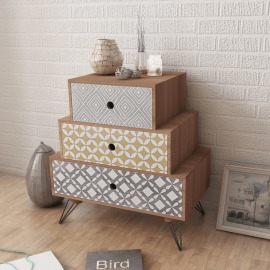 Tento noční stolek se 3 zásuvkami se vyznačuje decentním, avšak stylovým designem s elegantními ozdobnými vzory a může být používán rovněž jako odkládací skříňka. Tento noční stolek bude jak praktickým, tak i velmi dekorativním přírustkem do vaší ložnice, obývacího pokoje nebo odpočinkové zóny. Jeho velká obdélná horní deska se výborně hodí k vystavování dekorativních předmětů, zarámovaných fotografií, ale i hrnkových květin, zatímco jeho tři zásuvky poskytují dostatek prostoru k ukládání všech drobností tak, aby byly uspořádané a po ruce. Díky vysoce kvalitnímu materiálu MDF a silným ocelovým nohám jehlovitého tvaru je tento stolek velmi stabilní a odolný. Jeho sestavení je opravdu snadné.