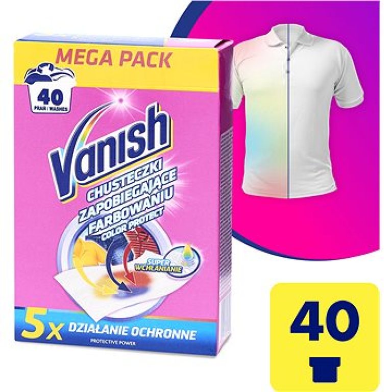 Prací ubrousky Vanish Color Protect jsou skvělým pomocníkem pro praní barevného prádla. Účinně chrání původní barvu oblečení v průběhu praní a zabraňují přenosu barviva mezi oděvy, a to díky mikrovláknové struktuře s vysokou absorpční schopností, která dokáže rychle pojmout uvolněná barviva ještě předtím, než zabarví ostatní prádlo. Prací ubrousky vám usnadní praní barevného oblečení, které již nemusíte třídit podle barev. Bez problému můžete vyprat dohromady černobílou halenku s červenou sukní. Pro dokonalou ochranu prádla před obarvením během praní jsou tyto jedinečné prací ubrousky tou správnou volbou.Hlavní přednosti.ochrana barvy v průběhu praní.zabránění zabarvení ostatního prádla.mikrovláknová struktura s vysokou absorpční schopností.není nutné třídit prádlo podle barev.vysoká účinnost.pro méně barevné prádlo lze použít pouze polovinu ubrousku.Použití.Rozložte ubrousek a umístěte ho na dno bubnu pračky. Poté vložte do bubnu prádlo. Pro méně barevné prádlo vám postačí pouze polovina ubrousku. Přidejte obvyklé množství pracího prostředku a zvolte vhodný prací program. Po vyprání nechejte oblečení co nejrychleji uschnout, ubrousek vyjměte z bubnu a zlikvidujte.