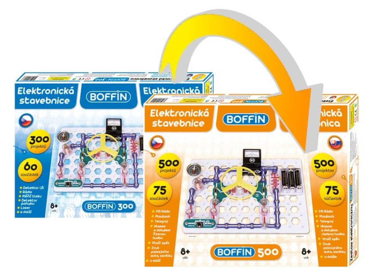 Elektronická stavebnica Boffin 300 obsahuje 60 súčiastok, z ktorých môžete postaviť tieto projekty:Všetky projekty (i súčiastky) zo stavebníc Boffin 100 a ďalšie– Detektor lži– Rádio– Vodný poplach– Merač tlaku– Detektor pohybu– Merač odporu– Zvukovú vlnu– Laser– ...viac