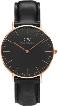 Klasické hodinky Daniel Wellington z kolekcie Classic Black Sheffield. Ideálny doplnok pre ženy uprednostňujúci analógové a guľaté hodinky. K ich skrášleniu naviac výrobca zvolil. Vo vnútri odolného, 6 mm vysokého púzdra, ktoré tvorí kvalitný oceľ nájdete spoľahlivý batériový (quartz) strojček poháňajúci v priemere 36 mm široký ciferník. Ten spoľahlivo chráni odolné minerálne sklíčko. Ako sami vidíte, púzdro zahalila ružové zlato, ciferník čierna a remienok čierna farba. Z hľadiska materiálu vedie kože a jeho dĺžku, v tomto prípade 200 mm si môžete ľahko upraviť na obvod svojho zápästia. Tieto hodinky disponujú stupňom vodotesnosti 3 ATM.