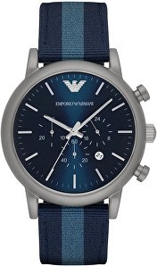 Módne hodinky Armani (Emporio Armani) z kolekcie Luigi. Ideálny doplnok pre mužov uprednostňujúci analógové a guľaté hodinky. K ich skrášleniu naviac výrobca zvolil. Vo vnútri odolného, 13 mm vysokého púzdra, ktoré tvorí kvalitný oceľ nájdete spoľahlivý batériový (quartz) strojček poháňajúci v priemere 46 mm široký ciferník. Ten spoľahlivo chráni odolné minerálne sklíčko. Ako sami vidíte, púzdro zahalila strieborná, ciferník modrá a remienok modrá farba. Z hľadiska materiálu vedie koža + textil a jeho dĺžku, v tomto prípade 220 mm si môžete ľahko upraviť na obvod svojho zápästia. Tieto hodinky disponujú stupňom vodotesnosti 5 ATM.