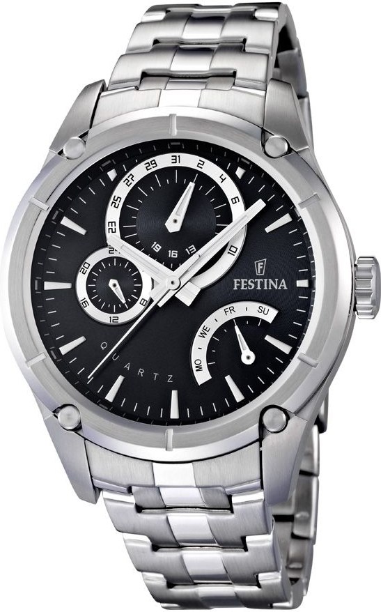 Festina / Kolekcia SPORT / Multifunkčné/analog typ: pánske funkcia: multifukčné strojček: quartz puzdro: ušľachtilá oceľ typ uchytenia: náramok ušlachtilá oceľ sklo: minerálne čiselník: bez čísiel - indexy vodotesnosť: 10ATM (100m) priemer: 44 šírka rem./nár.: 21,7 Originálne balenie, záručný list, návod v slovenčine. Oficiálna 2 ročná záruka Vám platí iba v prípade, že nakupujete u autorizovaného predajcu.Náš eshop je autorizovaným predajcom hodiniek značky FESTINA.HODINKY MôŽETE VYMENIŤ ZA HOCIKTORÉ INÉ, PRÍPADNE VRÁTIŤ AŽ DO 100 DNÍ OD VAŠEJ OBJEDNÁVKY. NAKUPUJTE PRETO ÚPLNE BEZ OBÁV !Naša rada pre Vás:Aj v prípade, že by ste si hodinky FESTINA nezakúpili v našom eshope, ale by ste sa rozhodli zakúpiť si ich u iného predajcu, prosím uistite sa, či je tiež autorizovaným predajcom tejto značky.Pri hodinkách zakúpených u neautorizovaných predajcov, nie je možné zaručiť ich pravosť a pôvod, nakoľko neboli do krajiny dovezené oficiálnym distribútorom pre Slovenskú Republiku. Zoznam autorizovaných aj neautorizovaných predajcov značky FESTINA si môžete pozrieť v nasledujúcom odkaze:http://festina.sk/eshop Quartz - quartzový strojček označuje generovanie presných časových impulzov pomocou kryštálu kremíka. Vďaka svojej jednoduchosti je veľmi spoľahlivý a spotrebováva len malé množstvo energie, čo má vplyv na výdrž batérie. Prvé hodinky s kremíkovým kryštáľom boli vyrobené v Kanade okolo roku 1950. Minerálne sklíčko- Minerálne sklíčko je najčastejšie používané sklíčko v hodinárskom priemysle. Je dostatočne odolné voči poškrabaniu a je odolnejšie voči rozbitiu ako zafírové sklíčko. Najobľúbenejšie je pri športových modeloch. Multifunkčné hodinky - hodinky majú dátum zobrazujúci deň v mesiaci aj v týždni. Tabuľka vodotesnosti 3 ATM/30m odolné voči striekajúcej vode a dažďu 5 ATM/50m môžete sa s hodinkami sprchovať umývať ruky pod tečúcou vodou 10 ATM/100m potápanie bez dýchacieho prístroja alebo plávanie 20 ATM/200m hĺbkové potápania Pre presnejšie pokyny ohľadom vodotesnosti sa prosím riaďte podľa návodu na použitie. Značka Festina je súčasťou skupiny Festina Group. Sídlo spoločnosti je v Barcelone a vysoko kvalitné výrobné centrum je vybudované vo švajčiarskom Herbetswille.Základná myšlienka, ktorou sa Festina riadí, je celkom jednoduchá: "Cena nezáleží na vzhľade, ale výhradne na kvalite." Túto zásadu nevymysleli žiadny dôvtipní stratégovia či manažeri značky, ale Miguel Rodriguez, duchovný otec značky Festina.
