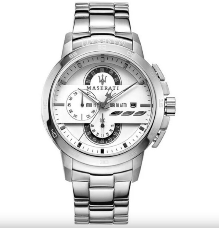 Popis: Značka: Maserati Pohlaví: Pánské Barva ciferníku: Bílá Materiál řemínku: Ocel Barva řemínku: Stříbrná Styl: Módní Pouzdro: Ocel Pohon: Mechanicko-automatický Materiál skla: Minerální Vodotestnost: 100 m Tvar hodinek: Kulatý Záruka: 2 roky.