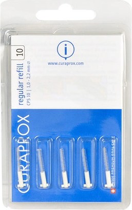 Medzizubné kefky Curaprox CPS 10 sú určené predovšetkým pre ľudí s interdentálnymi priestormi o veľkosti 1 - 2,2 mm. Patrí do radu CPS Regular, ktorá je vhodná k sekundárnej prevencii otvorených medzizubných priestorov a čistenie ortodontických pomôcok.Ani tá najlepšia zubná kefka nedokáže preniknúť do ťažko dostupných medzizubných miest, kde sa často hromadí povlak a vznikajú zubné kazy.Zubní lekári a odborníci na ústnu hygienu preto odporúčajú používať navyše každý deň pomôcky na čistenie medzizubných priestorov, ako sú medzizubné kefky, zubné nite či dentálne špáradlá.Vlastnosti medzizubných kefiek Curaprox CPS 10 Regular:.Čistí medzery o veľkosti 1 - 2,2 mm.Ideálne pre ortodontické prístroje, mostíky, korunky a pre starších používateľov so zníženou zručnosťou.Efektívny pri odstraňovaní tvrdého, usadeného povlaku.Odolné a trvanlivé vďaka silnejšiemu drôtenému jadru.1 balenie postačí na 1 mesiac používania.Neodporúčajú sa u uzavretých medzizubných priestorov s nepoškodenými papilami. Hľadáte inú veľkosť medzizubnej kefky Curaprox?Použitie:.Medzizubné kefky Curaprox CPS zavádzajte do medzizubného priestoru jemným tlakom. Čistenie vykonávajte jemným pohybom vpred a vzad.Viac o pomôckach na čistenie medzizubných priestorov si môžete prečítať v našom článku.