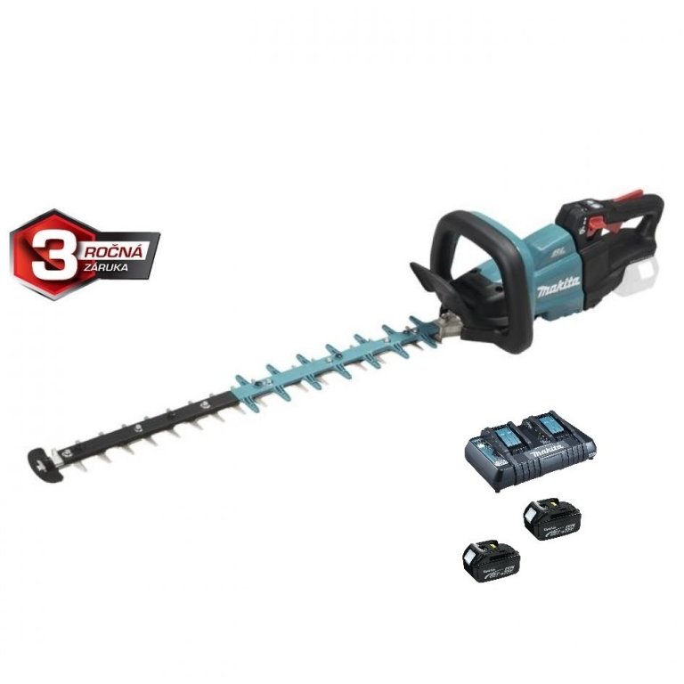 Aku plotostřih výkonnostně srovnatelný s benzinovým.. Spolehlivý bezuhlíkový motor.. Nízká hmotnost a ideální vyvážení pro pohodlnou práci.. Velmi účinná a rychlá práce.. Nový tvar nožů umožňující lepší zachycení větví a díky nízkému odporu i výrazně delší chod na jedno nabití akumulátoru.. Elektronika s možností nastavení 3 rychlostí.. Možnost sklopení rukojeti do 5 různých poloh.. Účinný antivibrační systém.. Součástí dodávky jsou dva akumulátory a rychlonabíječka► Příslušenství.. 2 ks akumulátoru BL1850B (197280-8).. Dvojitá rychlonabíječka DC18RD (196933-6).. Lišta (199099-1).