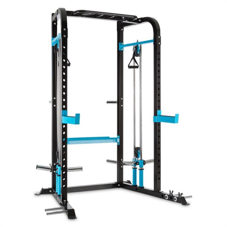 CAPITAL SPORTS poskytuje s posilovacím stojanem Tremendi ideálního multifunkčního trenéra pro domácí použití. Jak je známo z posilovny, posilovací klec je pestrou základnou pro cvičení, u kterých je zapotřebí výměna závaží a činek - zvláště pokud chcete trénovat bezpečně sami.Zařízení Tremendi od společnosti CAPITAL SPORTS je kompletně vyrobeno z práškově lakované oceli a umožňuje vysoké zatížení. V základní verzi nabízí možnost budování různých svalů. Především samozřejmě vzpírací cvičení s obouruční činkou. Proto jsou vlevo a vpravo v kleci dvě velká bezpečnostní ramena s ochranným gumovým povrchem, která mohou být výškově nastavena přes bezpečnostní zásuvný systém. Dvaadvacet výškových pozic je nastavitelných tak, že stojan může být přizpůsoben podle potřeby a zvolených cvičení.Tyče pro shyby nabízí různé možností uchopení rukojeti a umožňuje tím provádění nejrozličnějších shybových cvičení - ať už uchopením shora, podhmatem nebo pomocí nárazového uchopení. Tréninková výška je přibližně 2,10 m, aby mohli neomezeně trénovat i vysocí lidé. S 80 cm šířkou úchopu umožňuje zařízení pohodlnou šířku úchopu pro začátečníky i pro profesionály.Na zadní straně stojanu se nachází kladkostroj, se kterým se stává zařízení Tremendi od společnosti CAPITAL SPORTS všestranným fitness zařízením. Kladkostroj má horní a spodní lanovod, takže splní všechny tréninkové představy. Jako zátěž přitom lze používat všechny závaží s průměrem 30 nebo 50 mm. Pro zajištění závaží slouží dodávané zvířecí pružiny.Vizuálně přesvědčí pevná ocelová konstrukce svým robustním, černým práškovým nástřikem. Na přání lze stojan připojit přímo k podlaze, je však pevný a absolutně stabilní i bez pevné instalace.Vezměte prosím na vědomí, že zařízení je dodáváno jako montážní sada. Vezměte prosím na vědomí, že zařízení je dodáváno bez závaží a volné tyče činky.