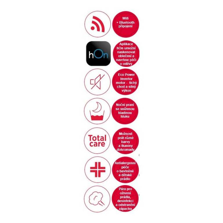 - Wifi + Bluetooth připojení - možnost bezdotykového připojení k Wifi a ovládání pračky přes aplikaci hOn se širokou škálou dodatečných informací a funkcí.