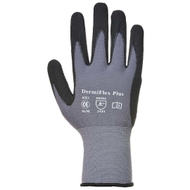 Ochranné pracovní pětiprsté rukavice DERMIFLEX PLUS, pletený pružný nylon kombinovaný se Spandexem potažený nitrilem a PU, kategorie CE II, zvýšená odolnost proti oděru, materiál jemný, z vrchu prodyšný, potažený tenkou vrstvou polyuretanu v dlaňové části a přes první články prstů na hřbet ruky, na úchopových místech terčíky z nitrilové pěny, ideální pro přesnou manipulaci v suchém prostředí, barva šedá, velikost XL.