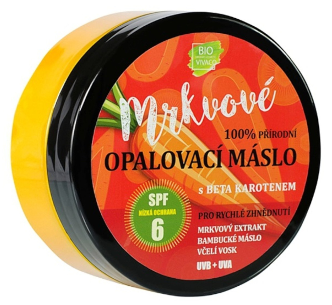 Vivaco Bio Carrot Suntan Butter přírodní mrkvové opalovací máslo 150 ml pro ženy.Dopřejte své pokožce zdravé, bronzové opálení bez parabenů, barviv a konzervantů. Opalovací máslo **Vivaco Bio Carrot Suntan Butter SPF6** díky beta-karotenu z mrkve a přírodním olejům chrání pokožku před UV zářením a.