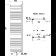 Specifikace výrobku: Výška: 1800 mm Šířka: 500 mm Hloubka: 52 mm Vzdálenost připojení: - 45 cm (boční) nebo 5 cm (prostřední) Barva: Černá RAL 9005 Materiál: Ocel Váha: 12,65 kg Reakce na oheň: A1 Pracovní teplota: max 95 °C Maximální pracovní tlak: 0,6 Mpa Topný výkon: - 75/65/20 °C - 820 W Spojení: ...